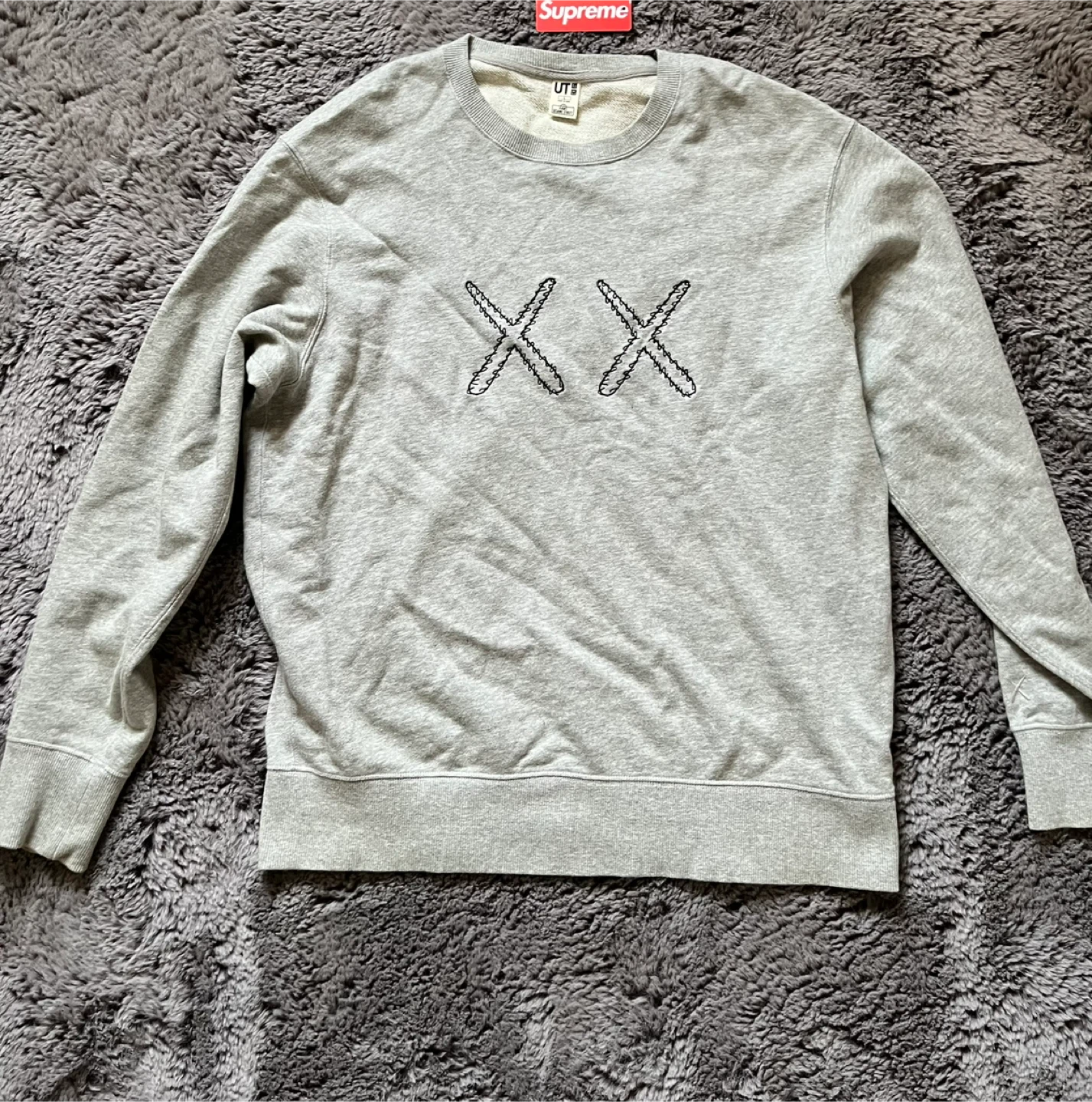 This Uniqlo UT crewneck sweatshirt features a KAWS design with the iconic XX graphic on the front and a collage of KAWS characters on the back. It's made from a comfortable cotton blend. A great piece for fans of KAWS and streetwear!