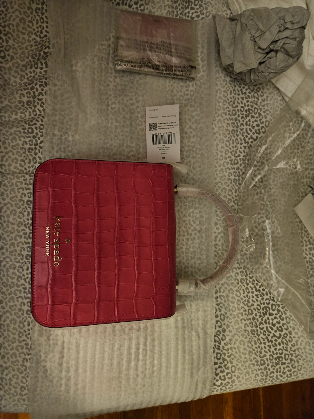 Small festive pink handbag. Crocodile-embossed leather. Top handle. Kate Spade New York branding. matches Kate Spade festive pink slim credit card holder.