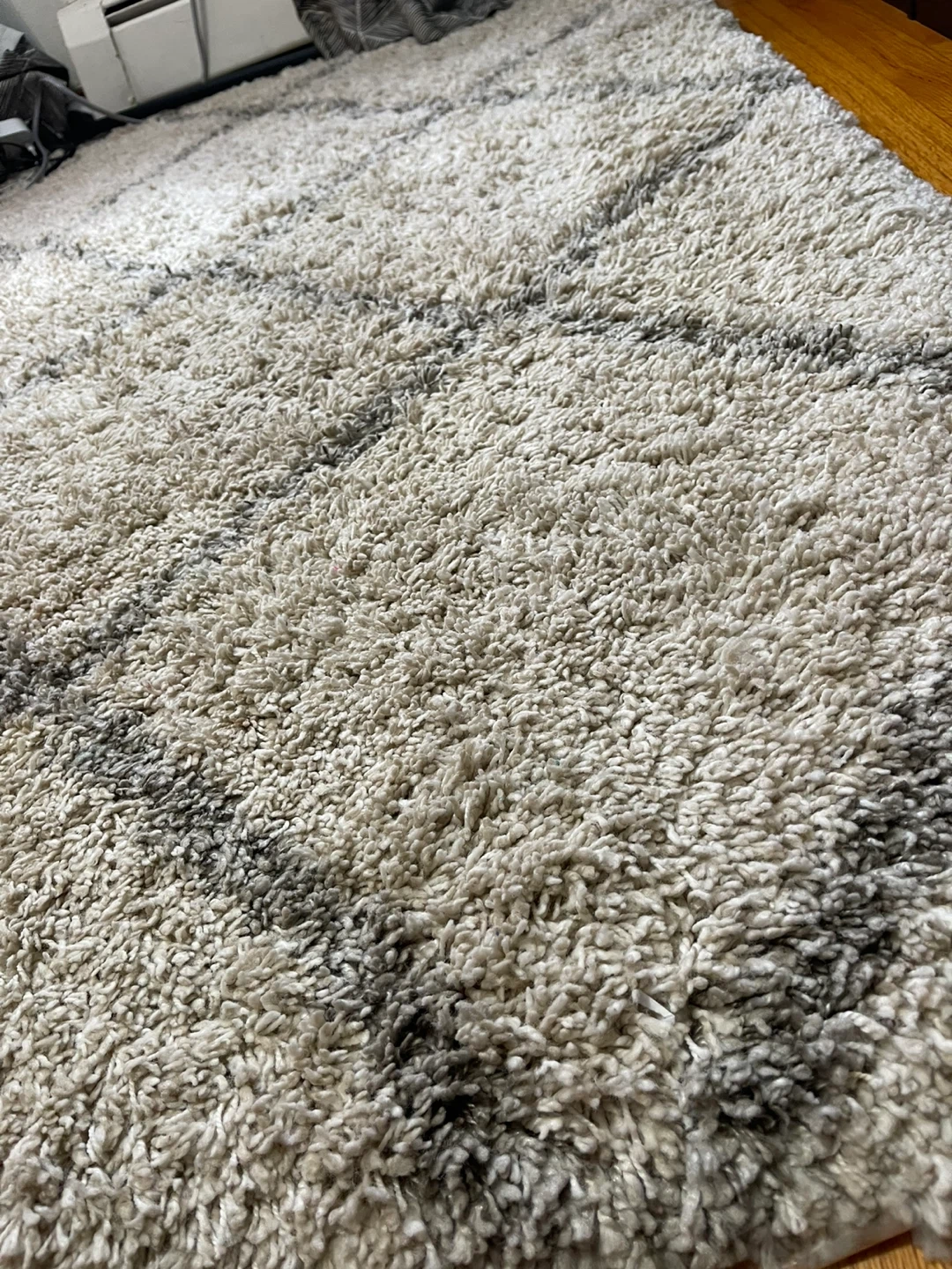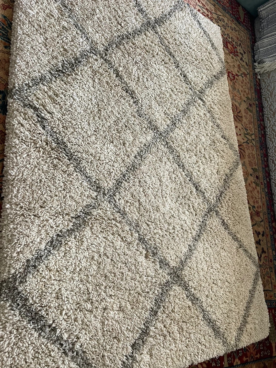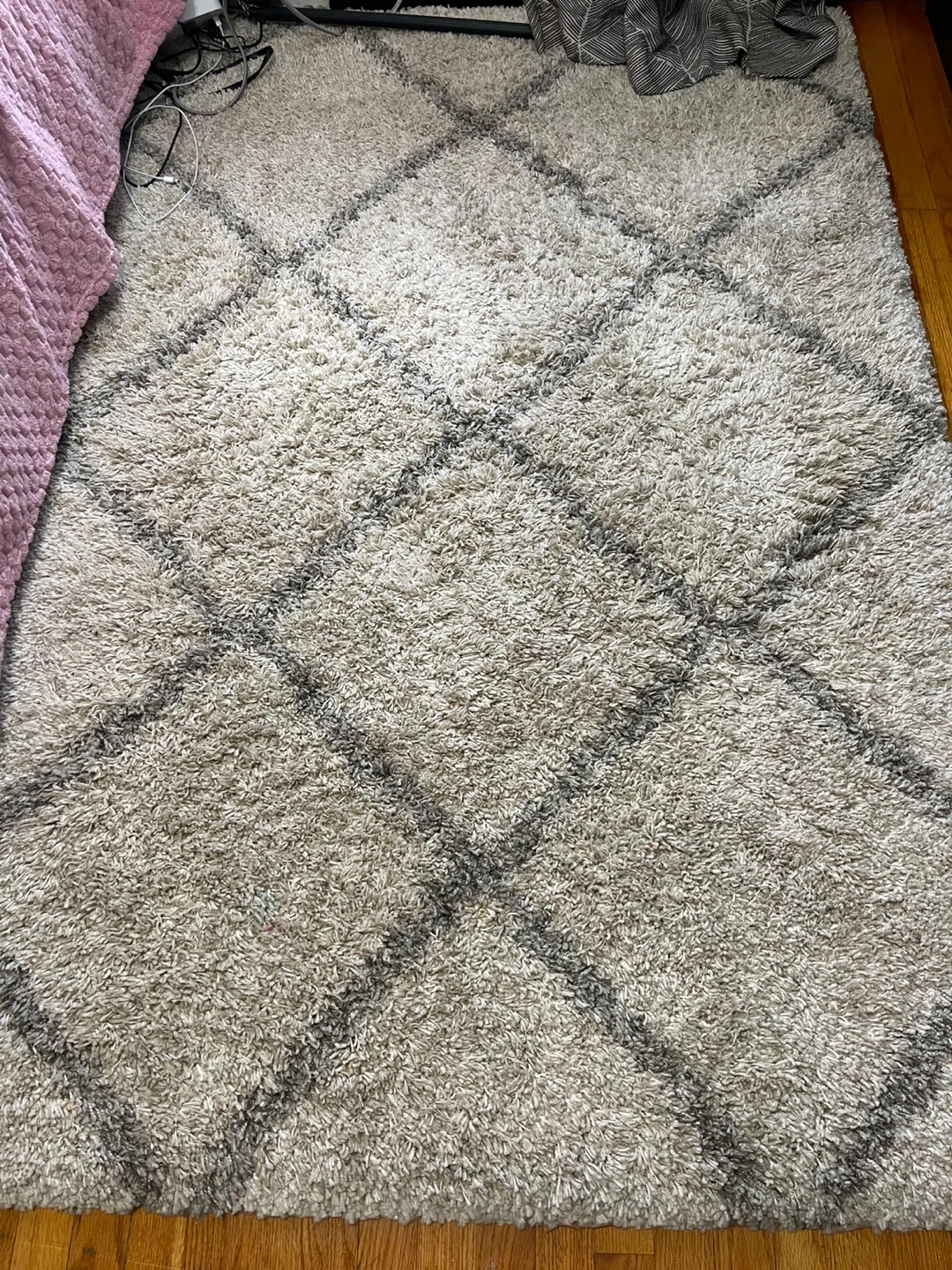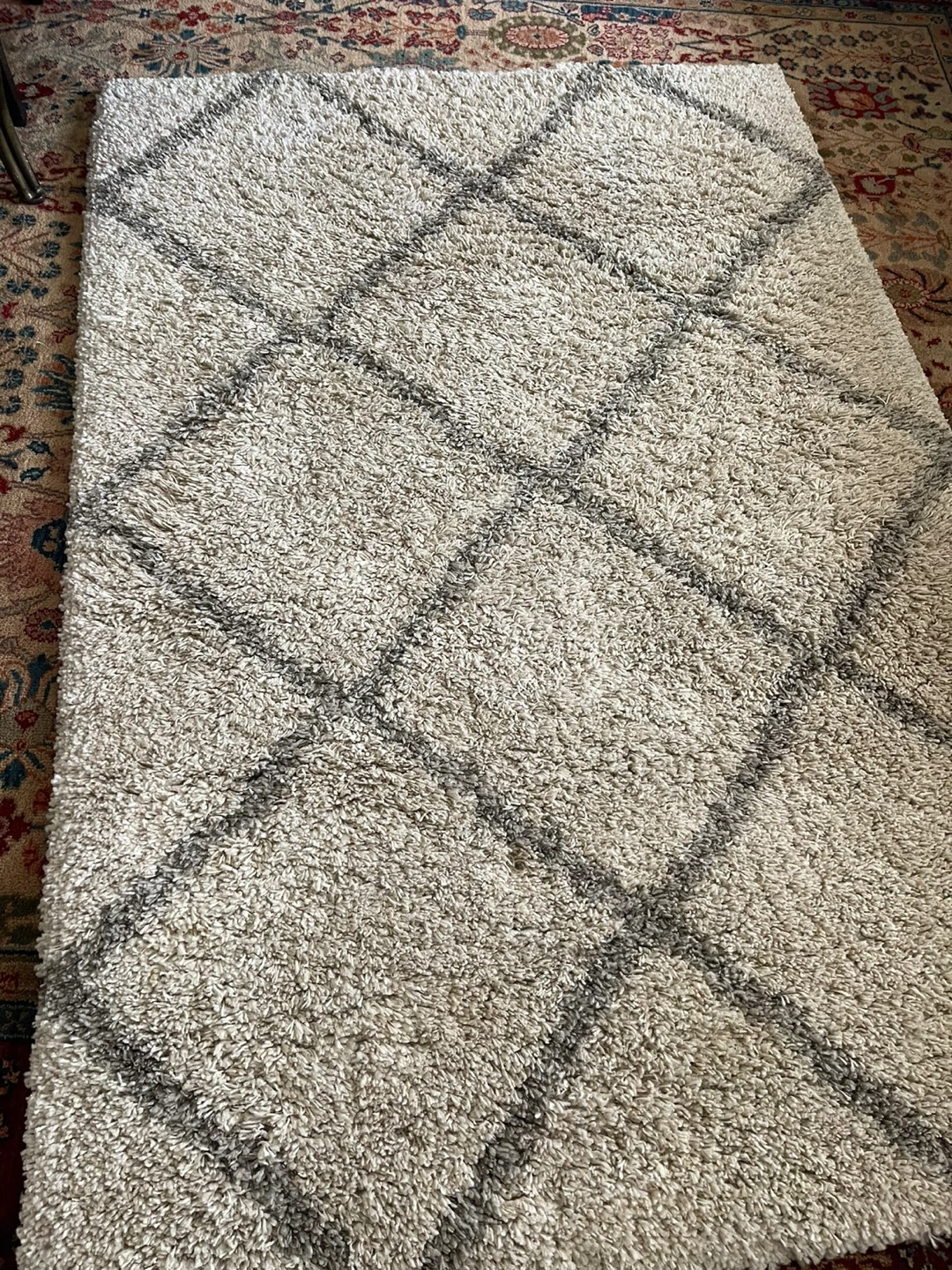 Selling a shaggy area rug with a cool diamond pattern! It's in good condition and would look great in any room. The rug measures approximately 6 feet by 7 feet.
