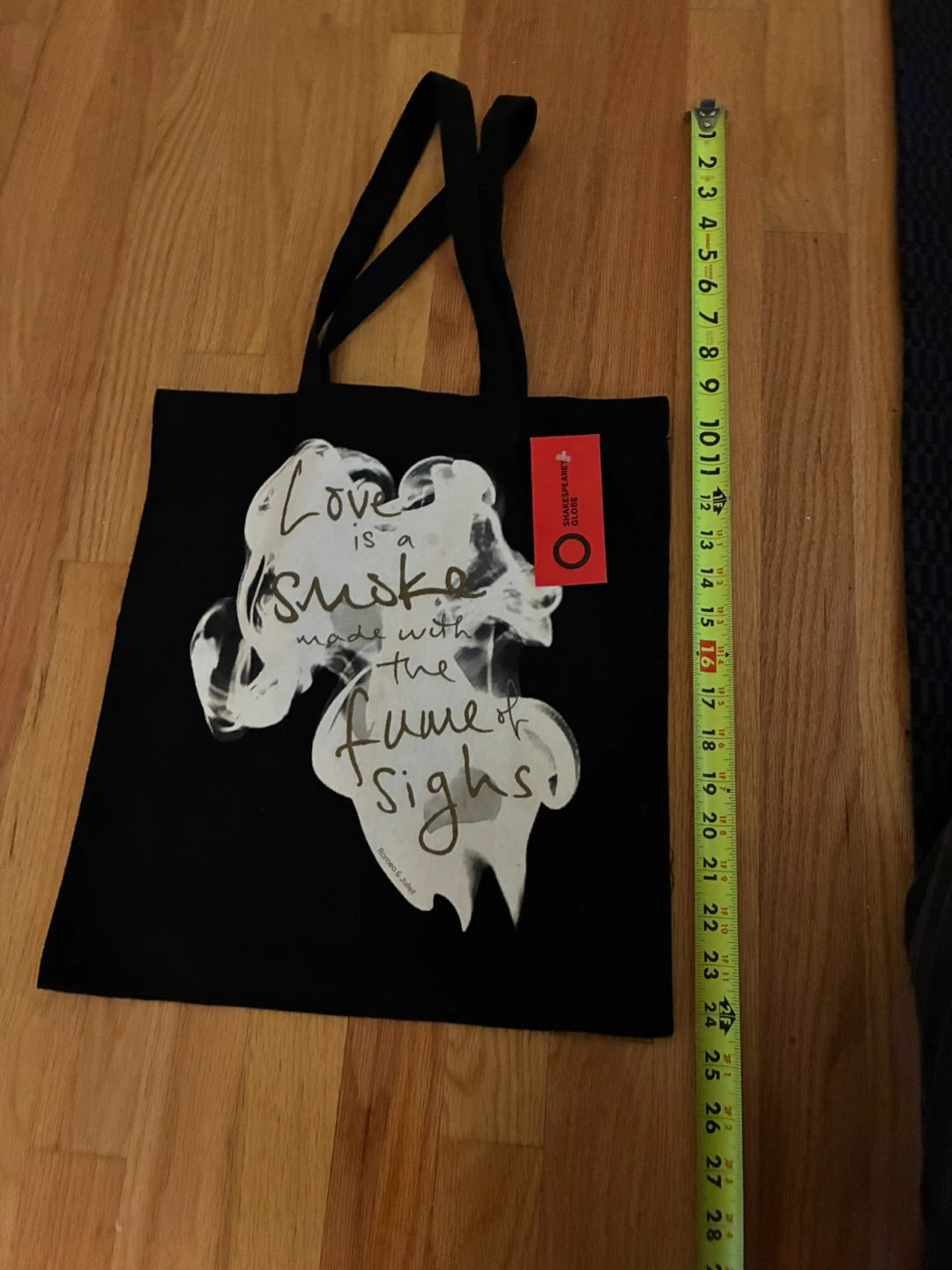 60Black tote bag from Shakespeare's Globe! Features a quote from Romeo & Juliet: 'Love is a smoke made with the fume of sighs' Purchased in London. Never used. Tag still on!