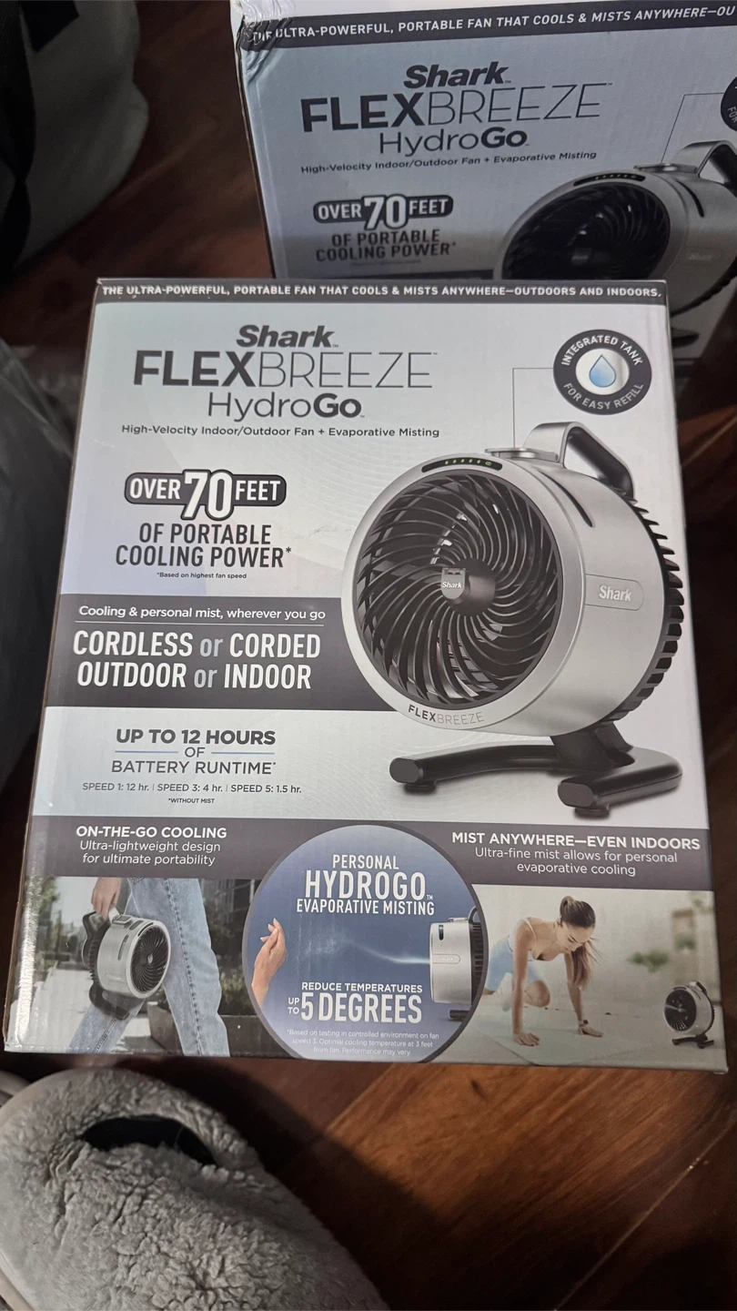 10I have 2 fan selling each for $80 I have a brand new Shark FlexBreeze HydroGo portable fan for sale! It's high-velocity and can be used both indoors and outdoors. It also features evaporative misting. - Cordless or corded operation - Up to 12 hours of battery runtime - Ultra-lightweight design for ultimate portability - Reduces temperatures up to 5 degrees - Integrated tank for easy refill