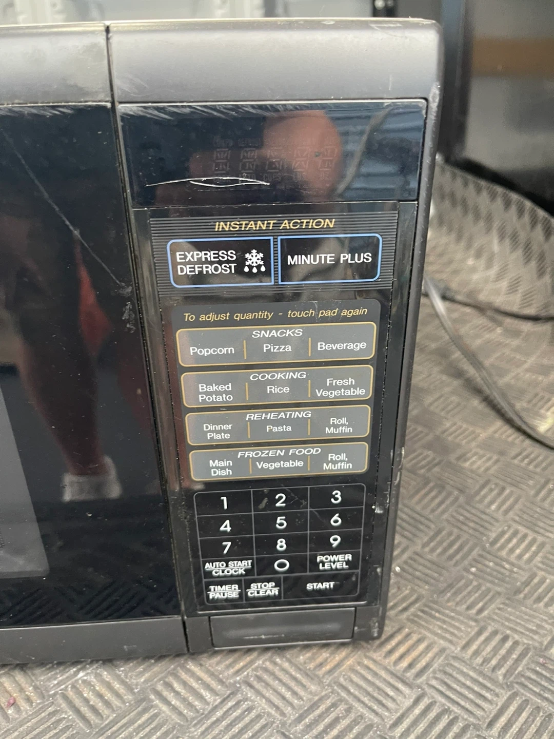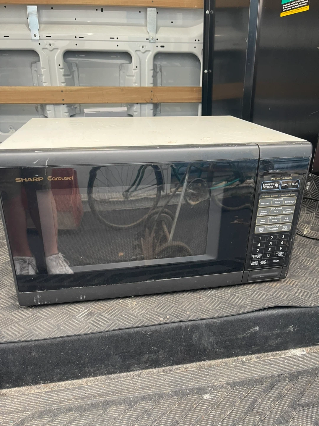 Selling a Sharp Carousel microwave oven. It has an express defrost and minute plus option. There are also settings for popcorn, pizza, beverage, baked potato, fresh vegetable, dinner plate, pasta, roll, muffin, main dish, vegetable, and roll muffin