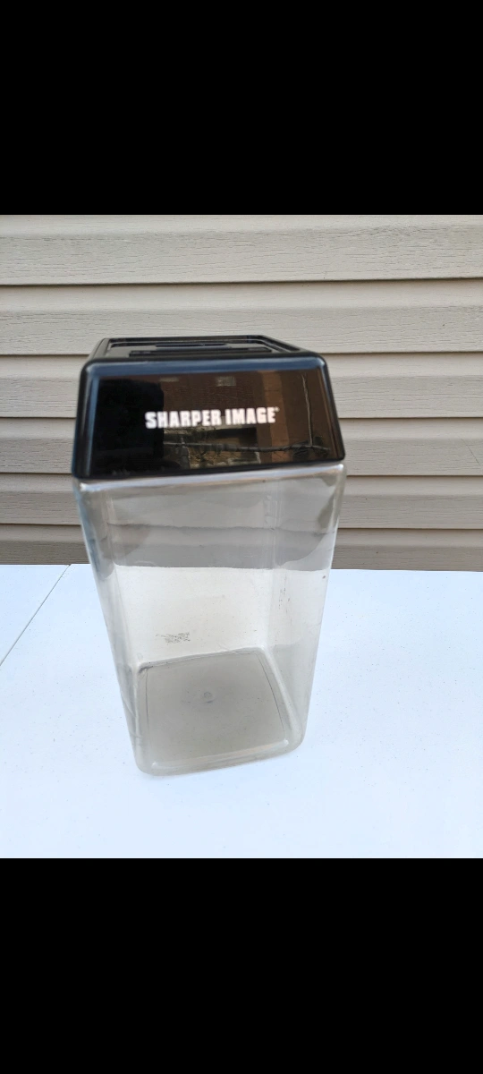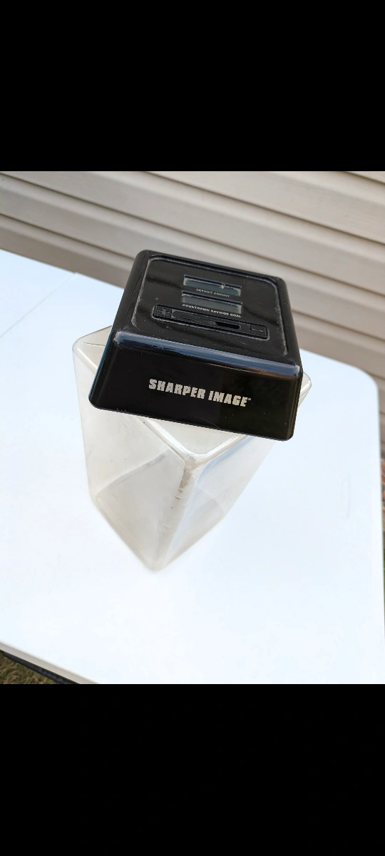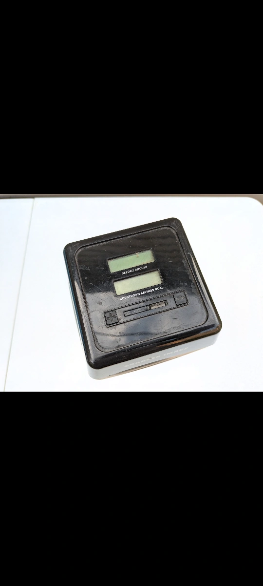 Digital piggy bank. Clear plastic container. Black top with digital display. Shows deposit amount and countdown savings goal. Used condition.