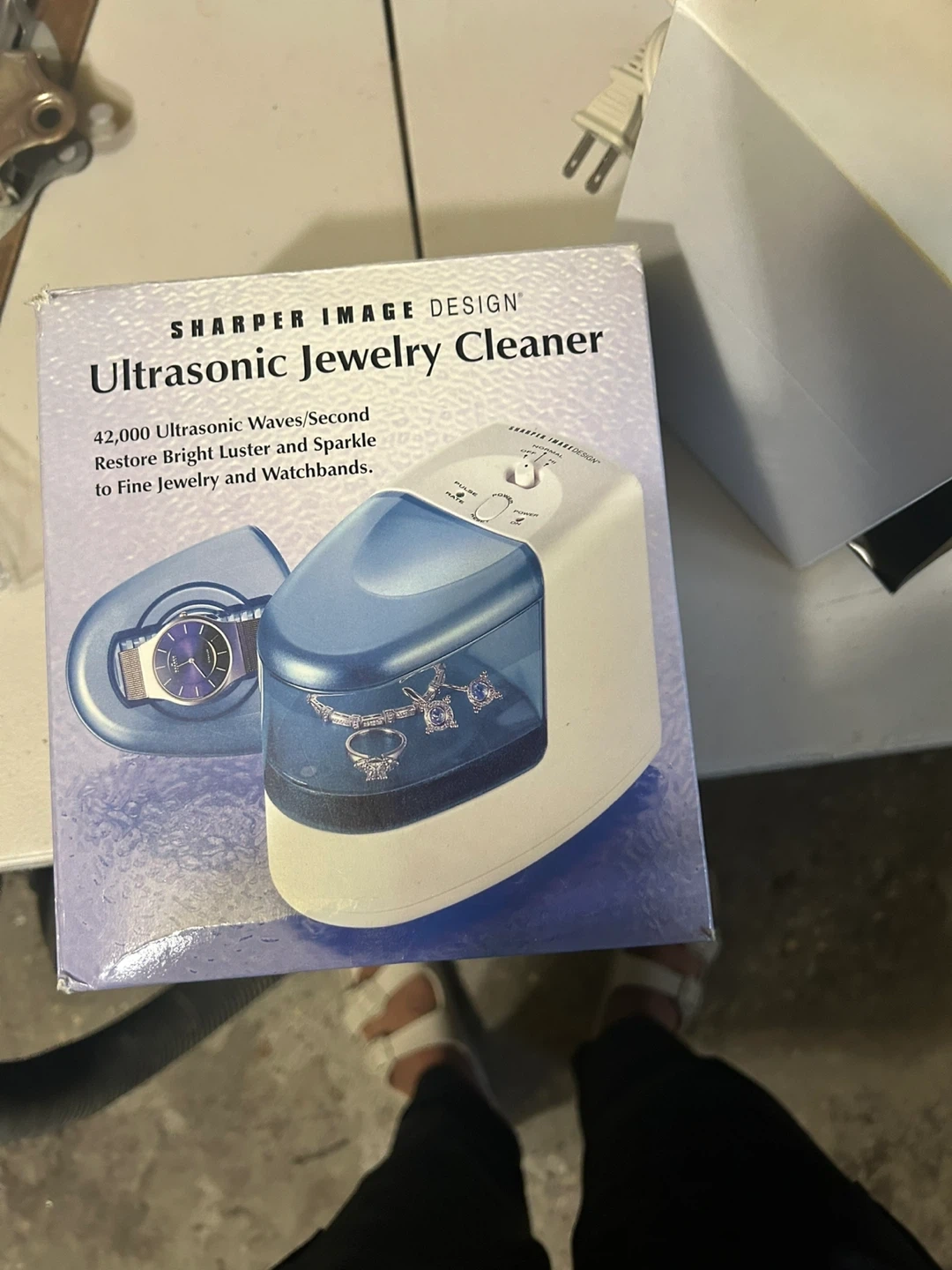 Selling a Sharper Image Design Ultrasonic Jewelry Cleaner. It uses 42,000 ultrasonic waves per second to restore bright luster and sparkle to fine jewelry and watchbands. It comes with the box!