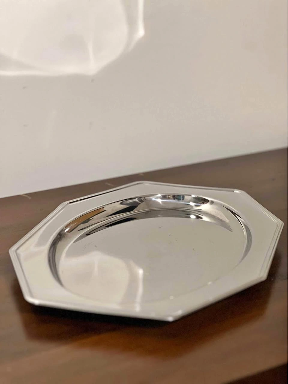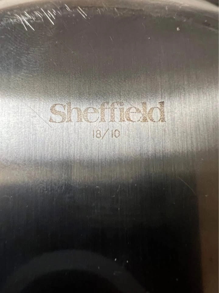 98This Sheffield 18/10 stainless steel serving tray is perfect for elegant dining, catering, or home entertaining. Its octagonal shape with a polished mirror finish makes it a stylish and functional addition to any table setting. Features: Brand: Sheffield Material: 18/10 Stainless Steel Size: 14.5” x 10" (Octagonal) Condition: Used with surface scratches