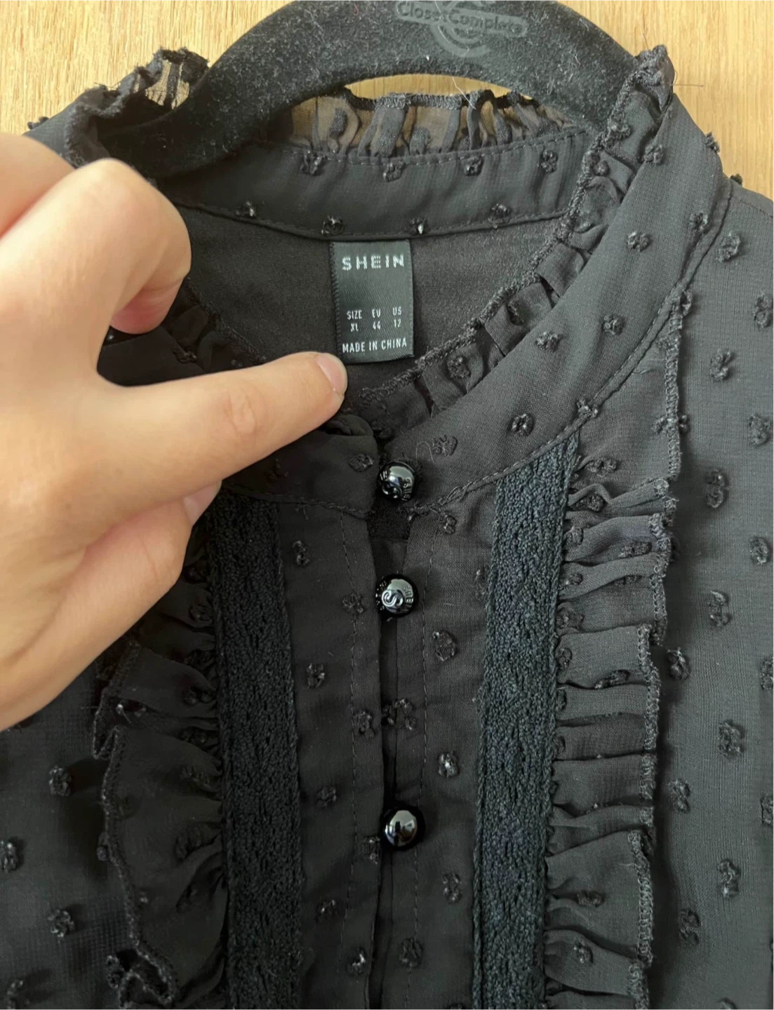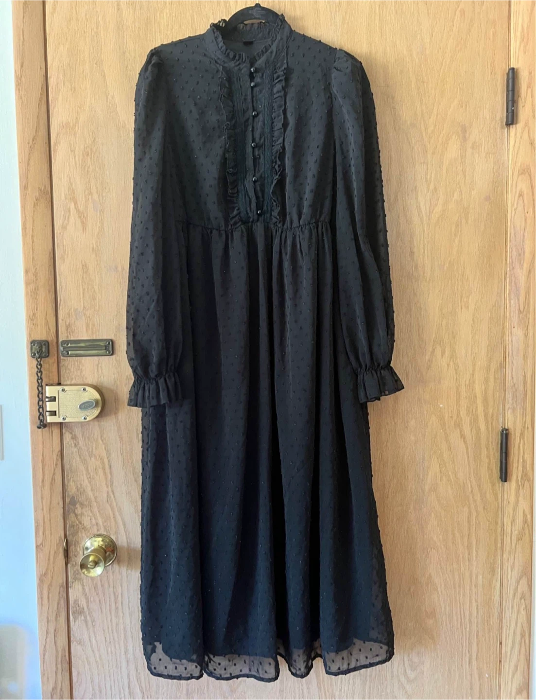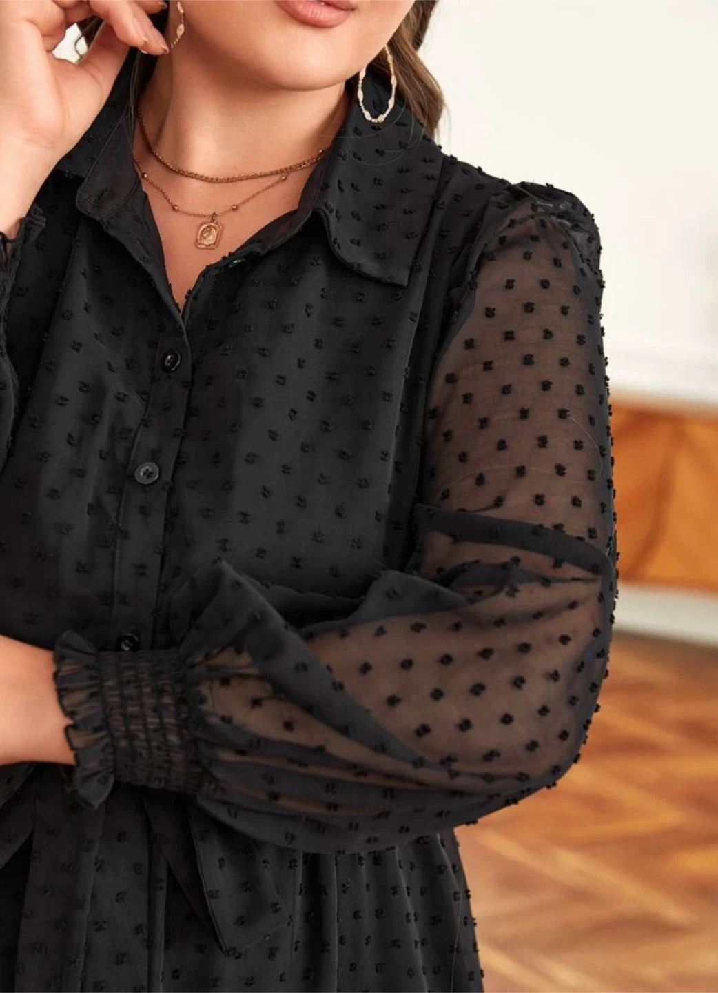 Selling a cute black polka dot dress from Shein in size XL! It features a sheer polka dot pattern and a button-down front. Perfect for dressing up or down