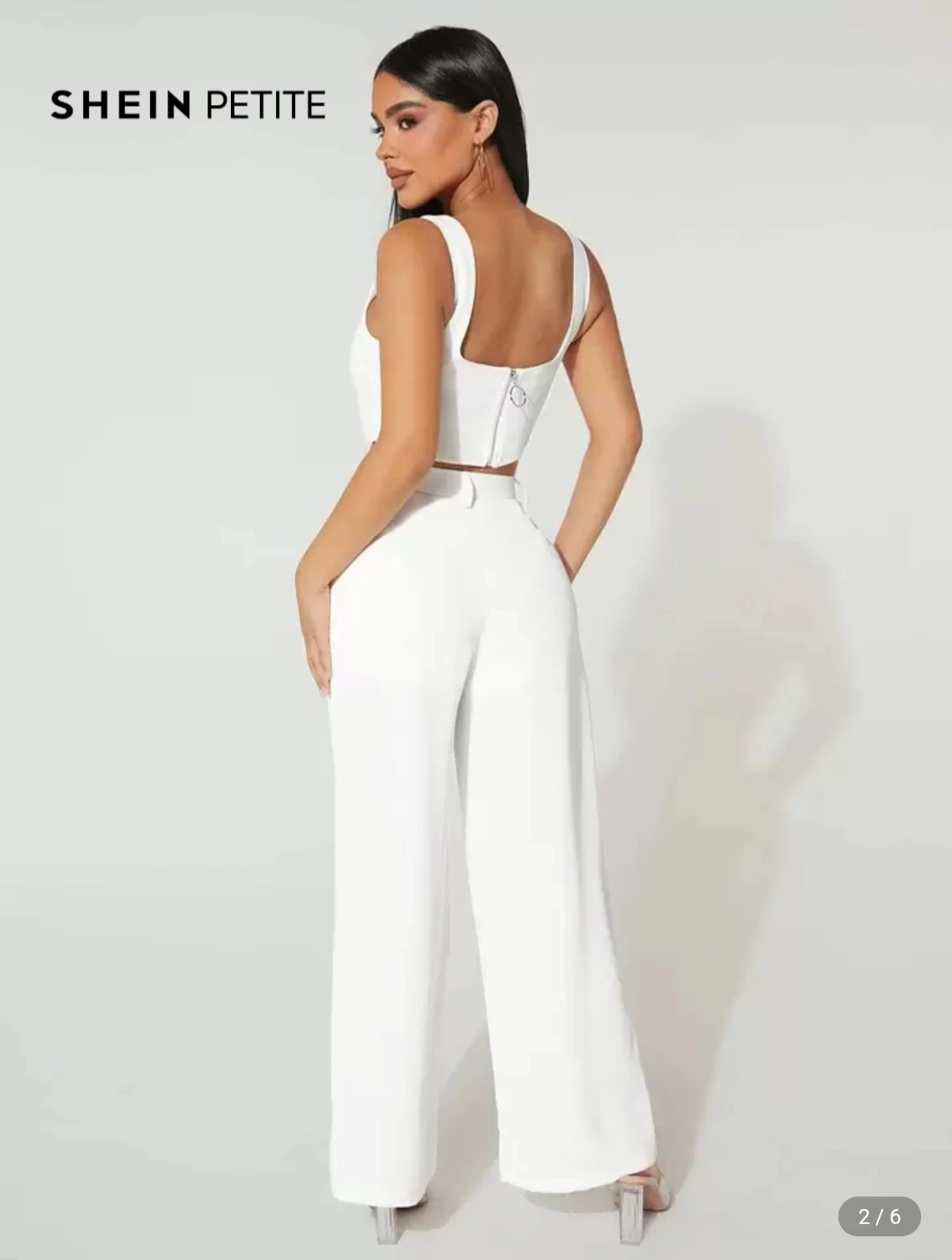 Selling a white two-piece set from Shein Petite! It's a stylish and clean look, perfect for various occasions. The set includes a cropped top and wide-leg pants, both in size petite. Great for someone looking for a chic and coordinated outfit!