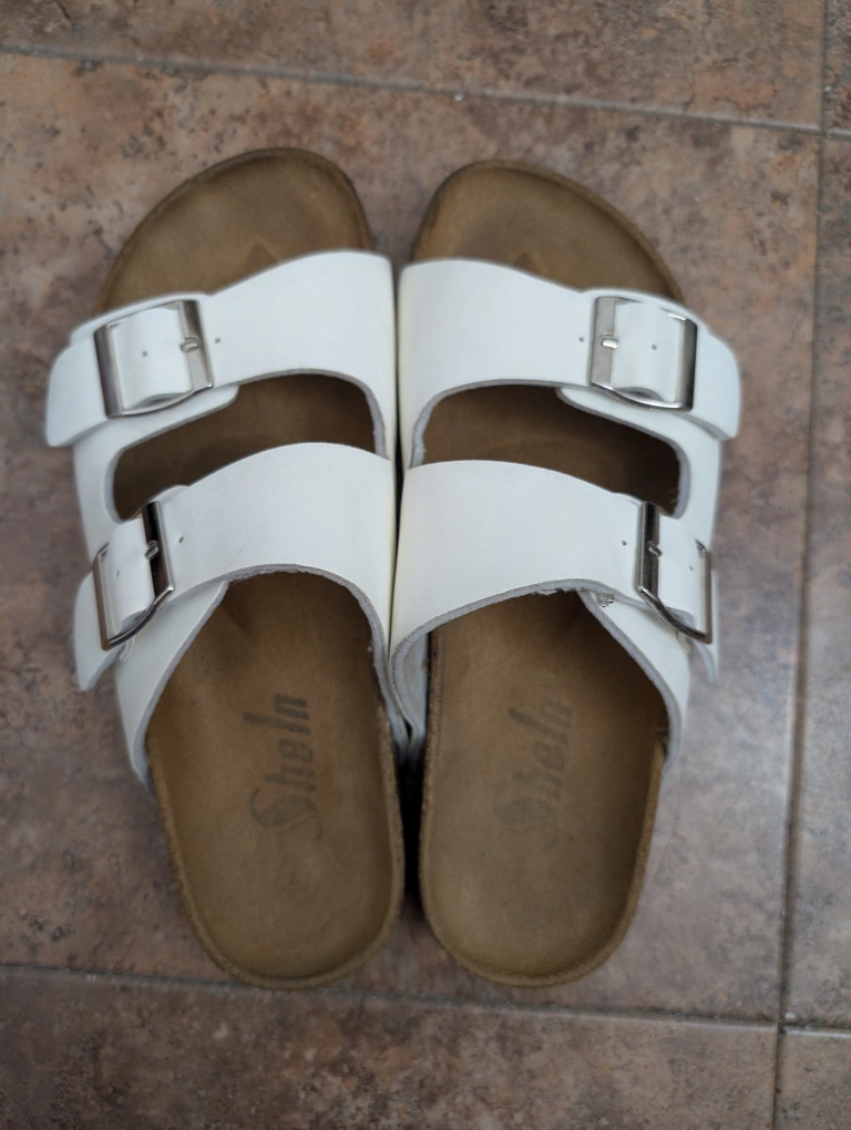 These are a pair of Shein sandals in white. They have a double strap design with adjustable buckles. The soles have a textured pattern for grip. Retro open breathable sandals Comfortable non slip durable slides Vacation style sandals Comfortable and easy slip-on sandals Fake Birkenstock style Fake Birkenstock dupes Size 37 US 7
