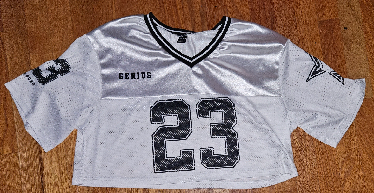 Selling a white jersey crop top from Shein! It features the word 'Genius' and the number 23 on the front. The sleeves also have designs on them. It's a size m and in great condition!