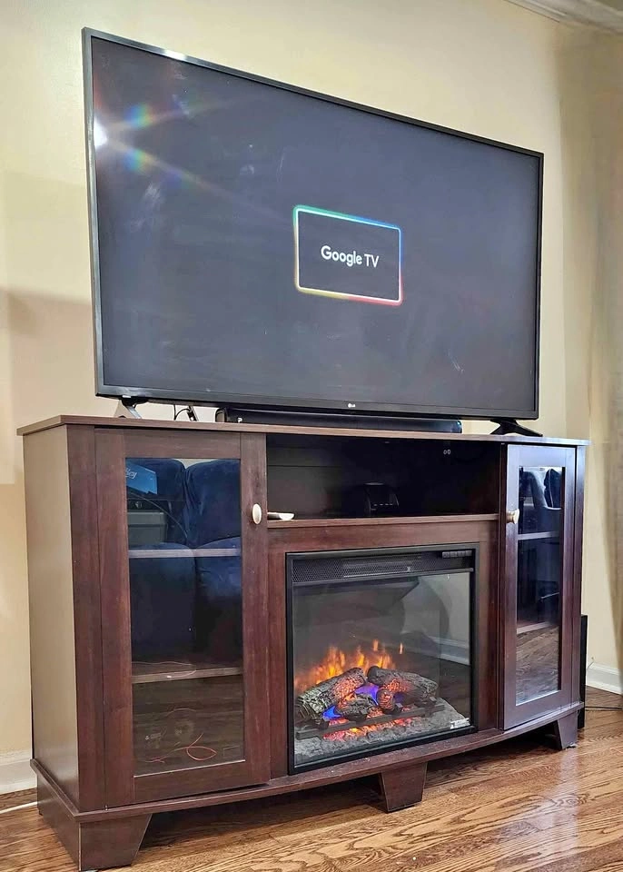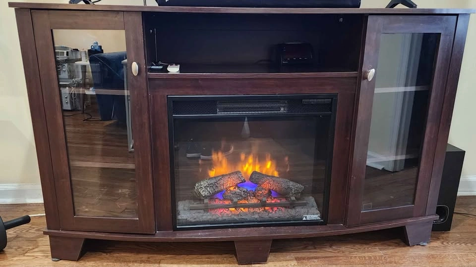 5* No Lowballs. This was purchased for more than $500 from PC Richard. You need 2 people to lift this. Bell'O Della 59" 7 Shelf Electric Fireplace TV Console Midnight Cherry media console with 28-inch infrared quartz electric fireplace. Highlights: Infrared Heat: Comfortable warmth for up to 1,000 sq. ft. without drying the air. Spectrafire Flames: 6 color settings (3 blue, 3 amber), with or without heat. Safety Features: Cool-touch glass, Safer Plug, and overheating protection. Customizable Storage: Adjustable shelves, media compartments, and cable pass-throughs. Fits TVs up to 70" (140 lbs.) Remote included