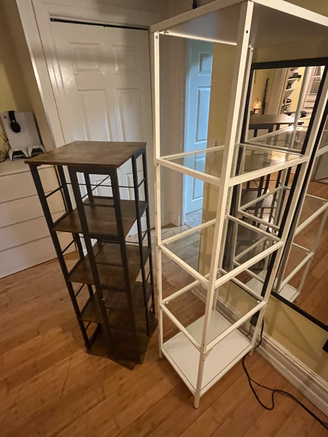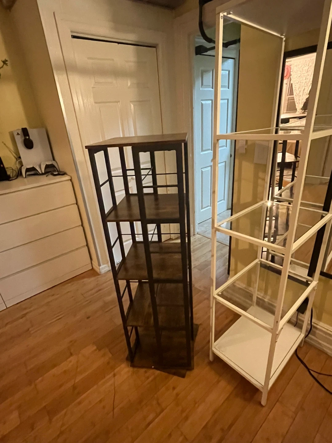 Selling two shelving units! One is brown with a wood-look finish that rotatea, and the other is white with glass shelves. Both are in good condition and ready to add some storage to your space