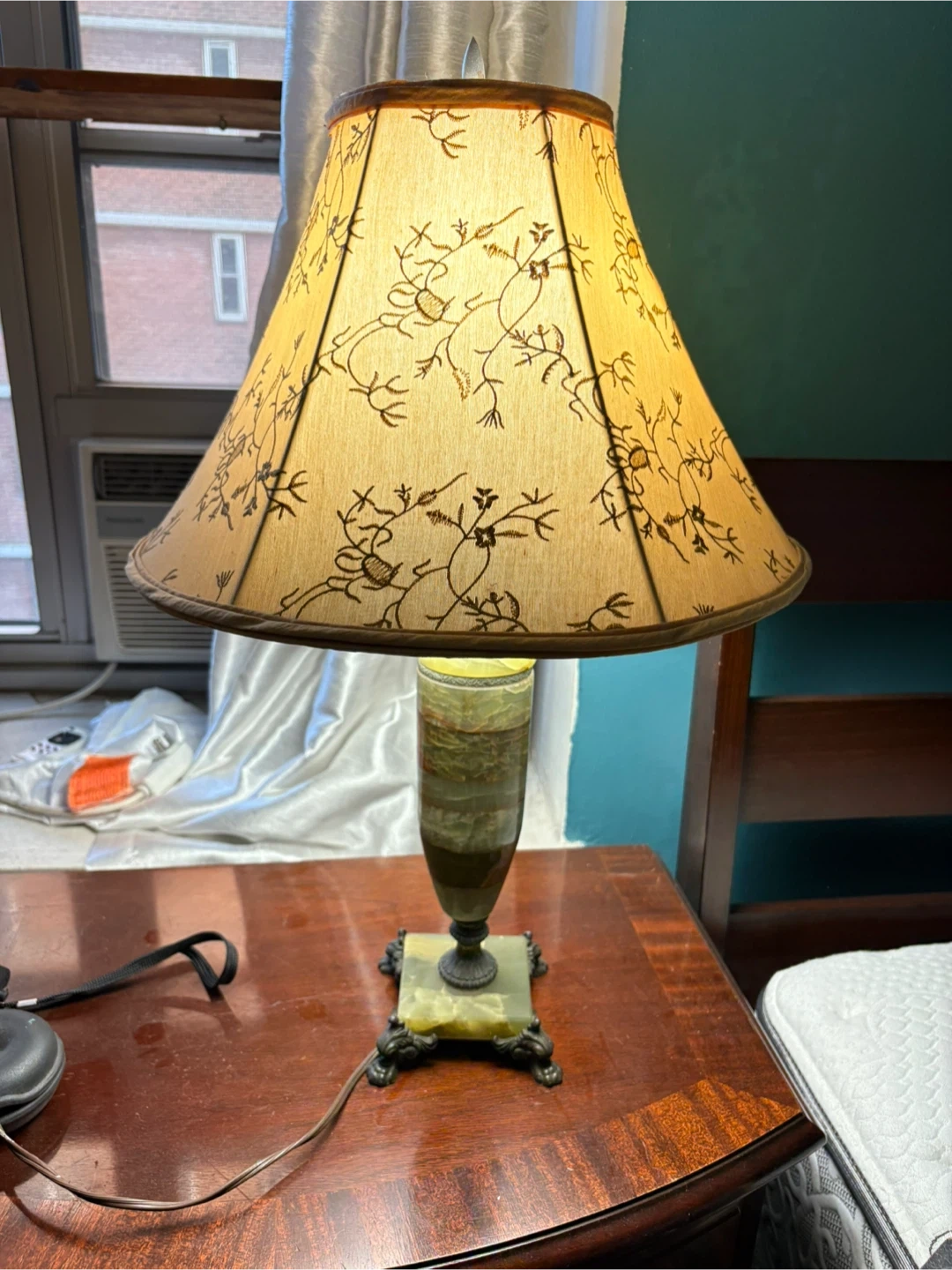 Selling a beautiful vintage lamp with a floral patterned lampshade and a green marble-like base. It gives off a warm and cozy light, perfect for a bedroom or living room. MUST PICK UP BY MONDAY