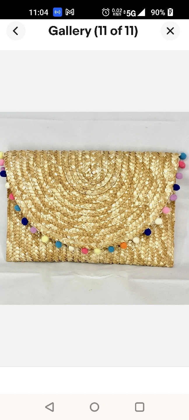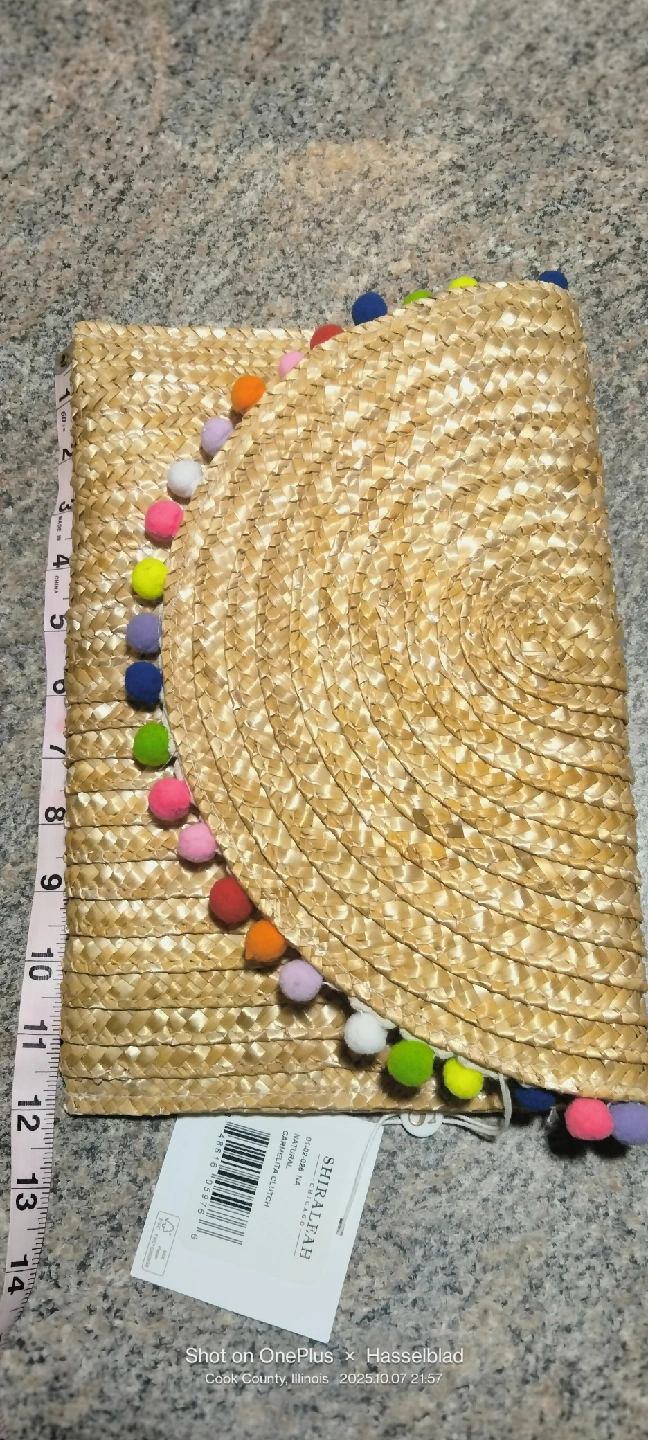 This is a Shiraleah straw clutch, adorned with colorful pom poms! It measures approximately 13 inches in length and 8 inches in width, It's new with tags.