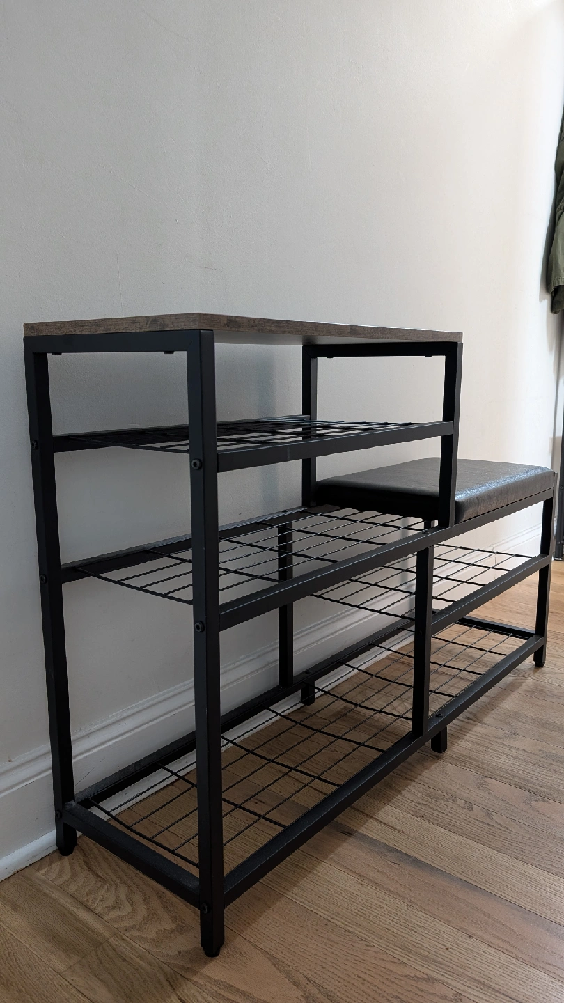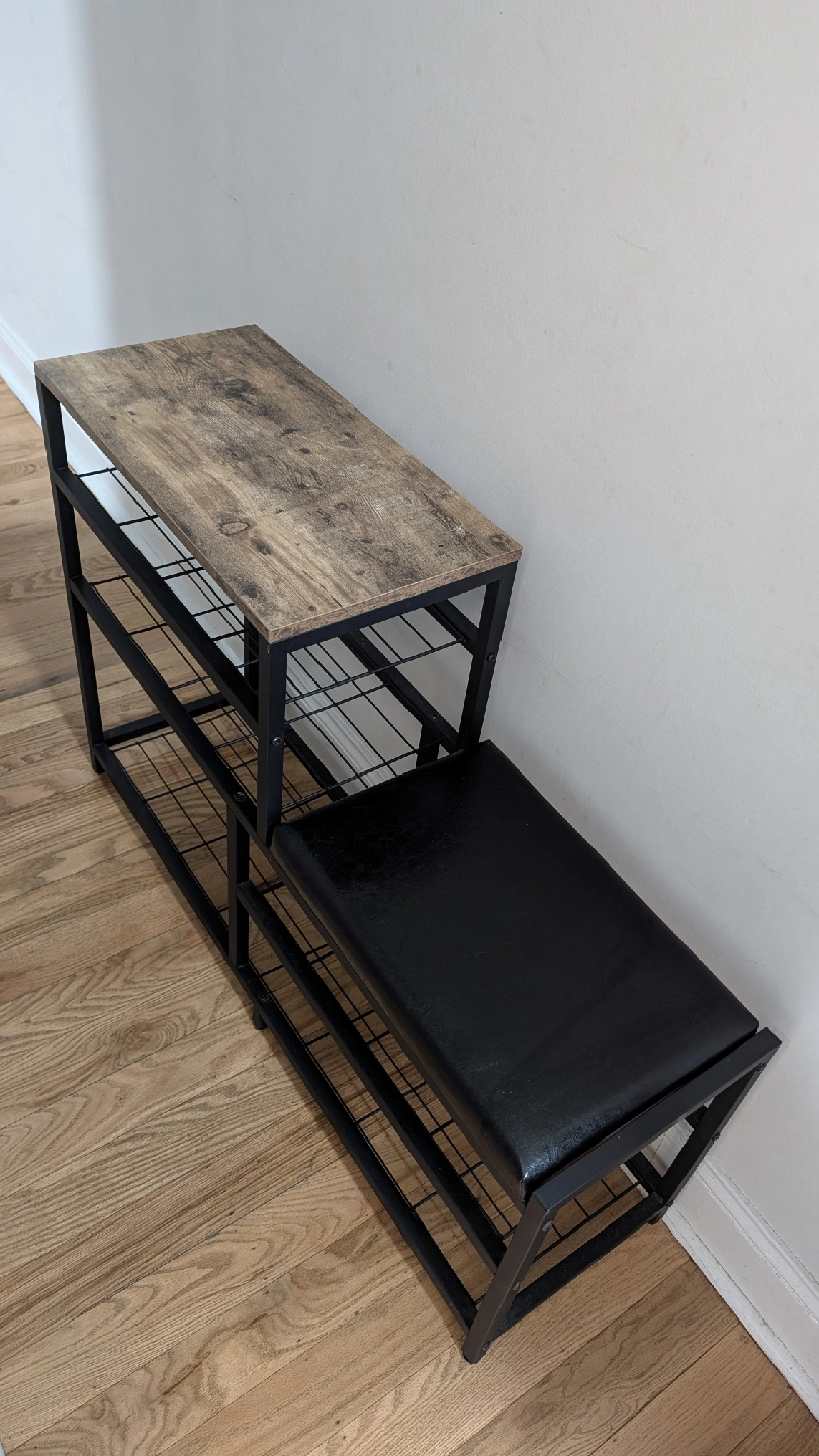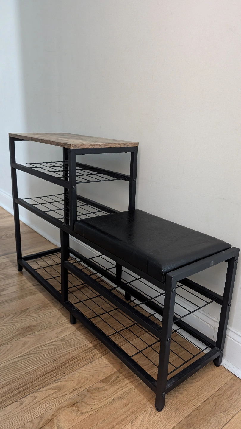 65This shoe rack bench with storage is in great condition and ready to help organize your entryway or closet! It features a sturdy metal frame with a wood-look top and a comfortable padded bench. Perfect for storing shoes and providing a convenient place to sit while putting them on.