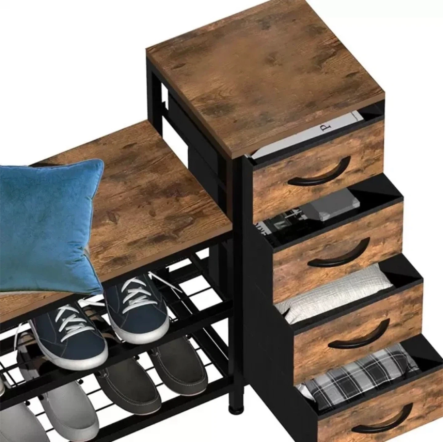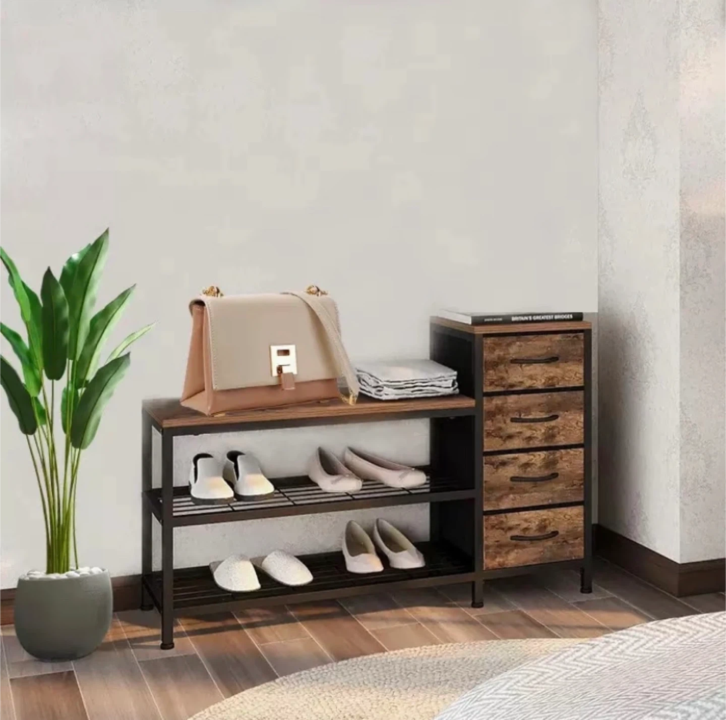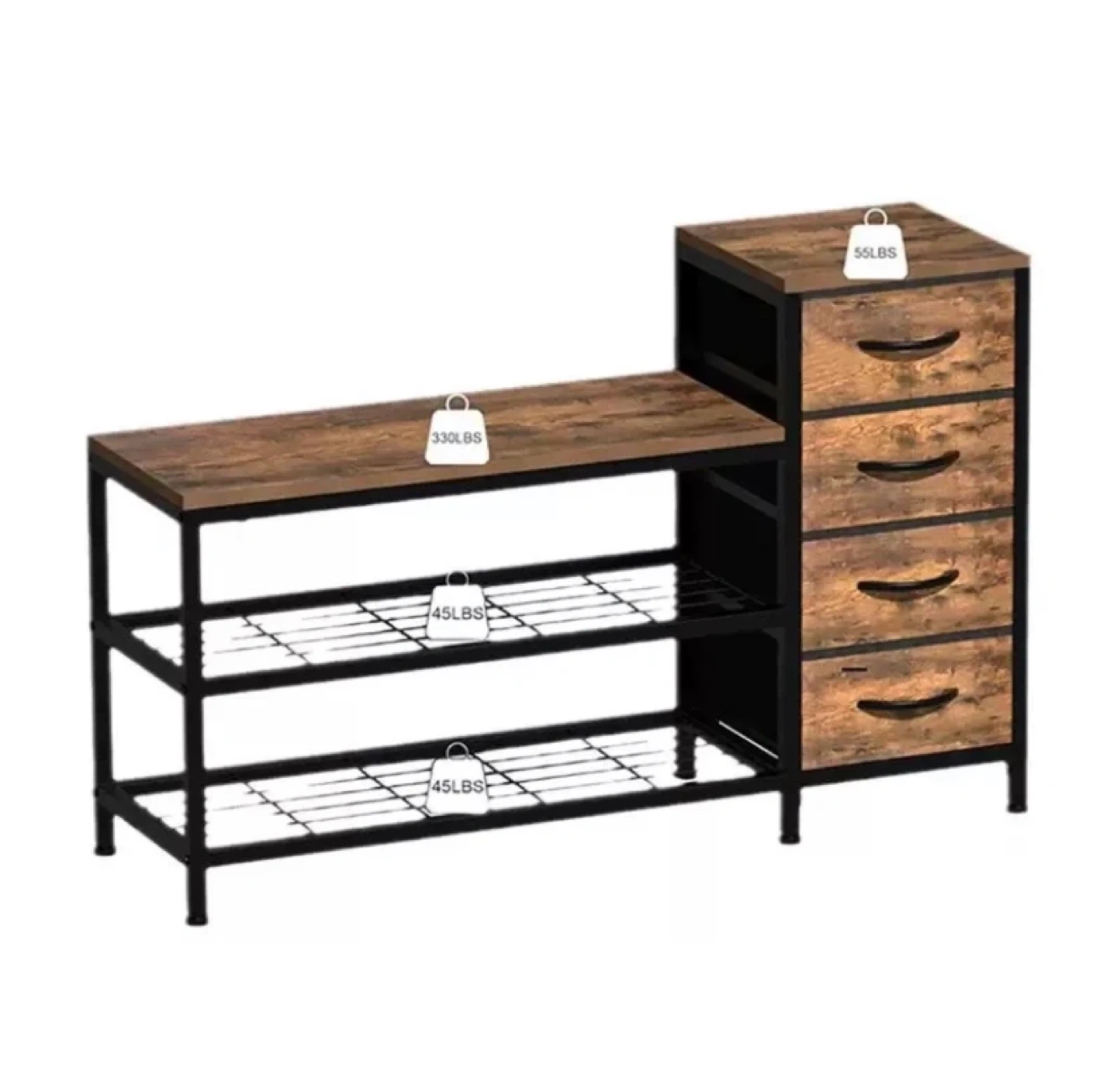 This is a shoe rack bench with storage drawers. It has a rustic brown and black finish. The overall dimensions are approximately 70cm wide, 41cm tall, and 30cm deep. The drawers are about 30cm wide, 26cm deep, and 13cm tall. It's great for organizing your entryway or closet!