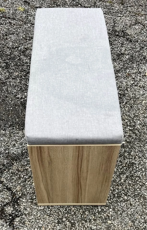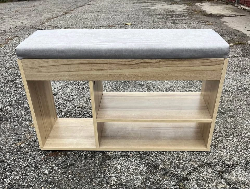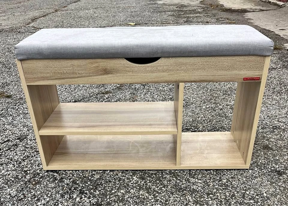 This is a Mr. Ironstone shoe storage bench. It features a padded seat, a hidden storage compartment, and two tiers of shelving for organizing shoes. The bench is very sturdy with minimal blemishes. The padded seat does have some stains from kids putting the shoes on top. This can be washed or covered with a new piece of fabric. This piece of furniture is perfect for use in entryways, hallways, or bedrooms to provide a convenient place to sit while putting on shoes and to keep the area organized. Cash only Pick up in Sheepshead Bay Brooklyn