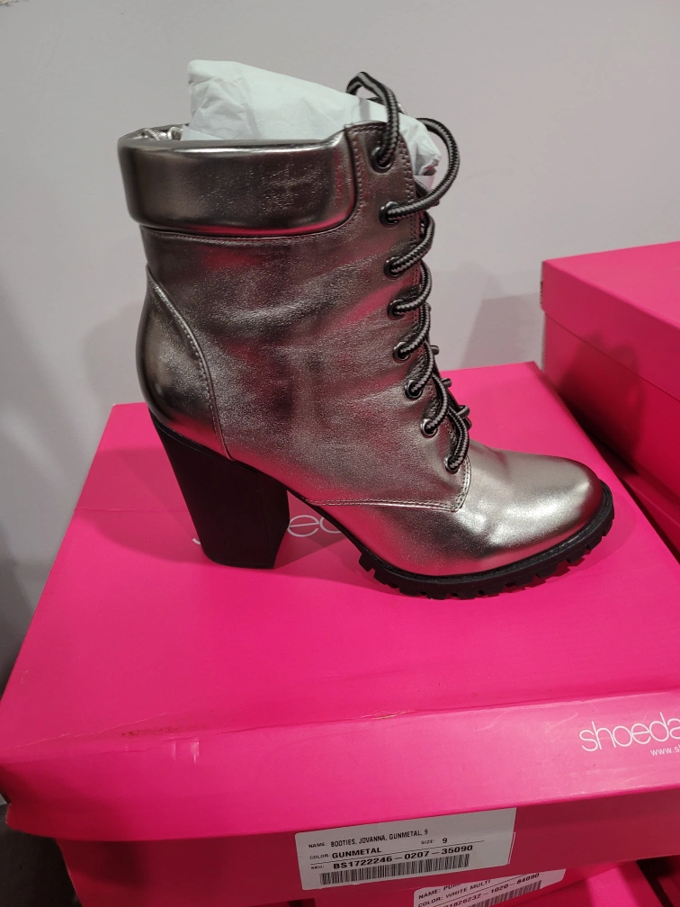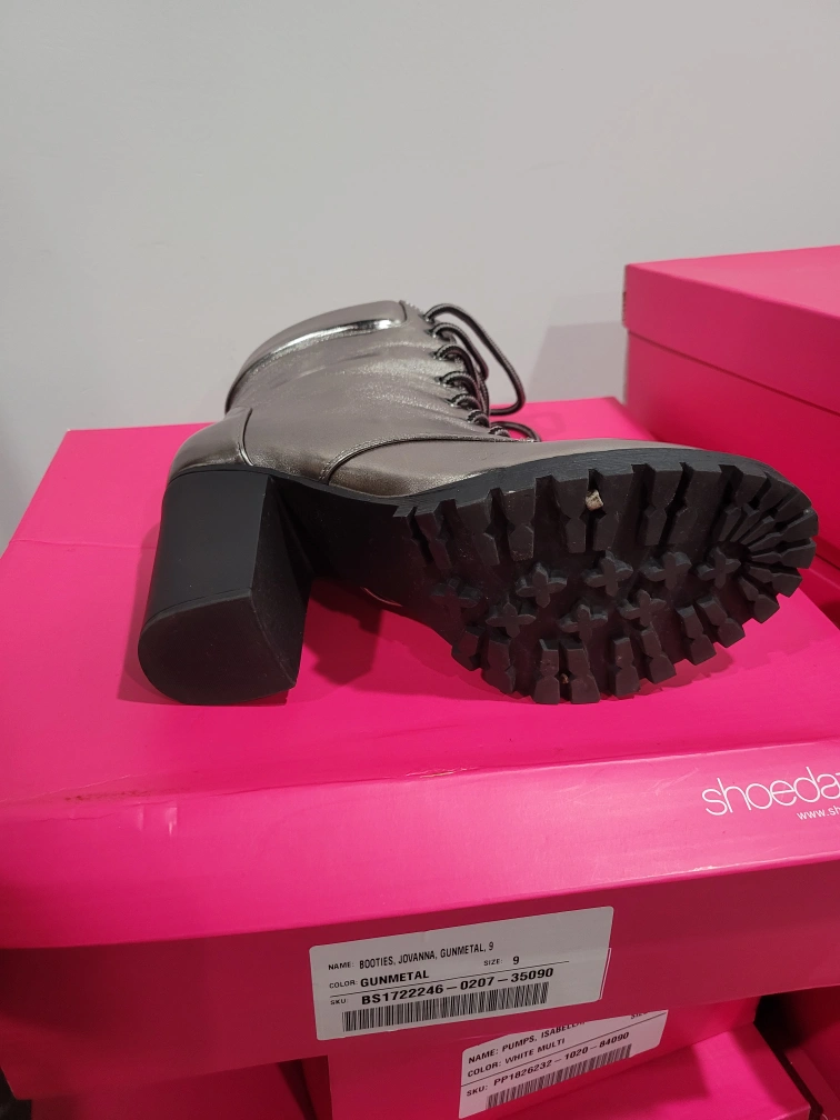 ShoeDazzle booties in gunmetal color, size 9! These boots have a stylish look with a block heel and lace-up design. They're in great condition and ready for a new home