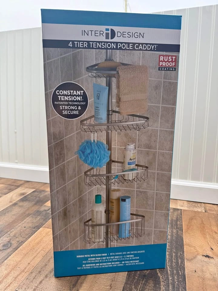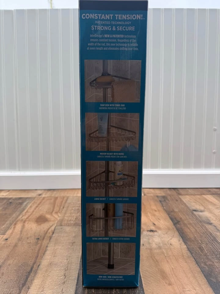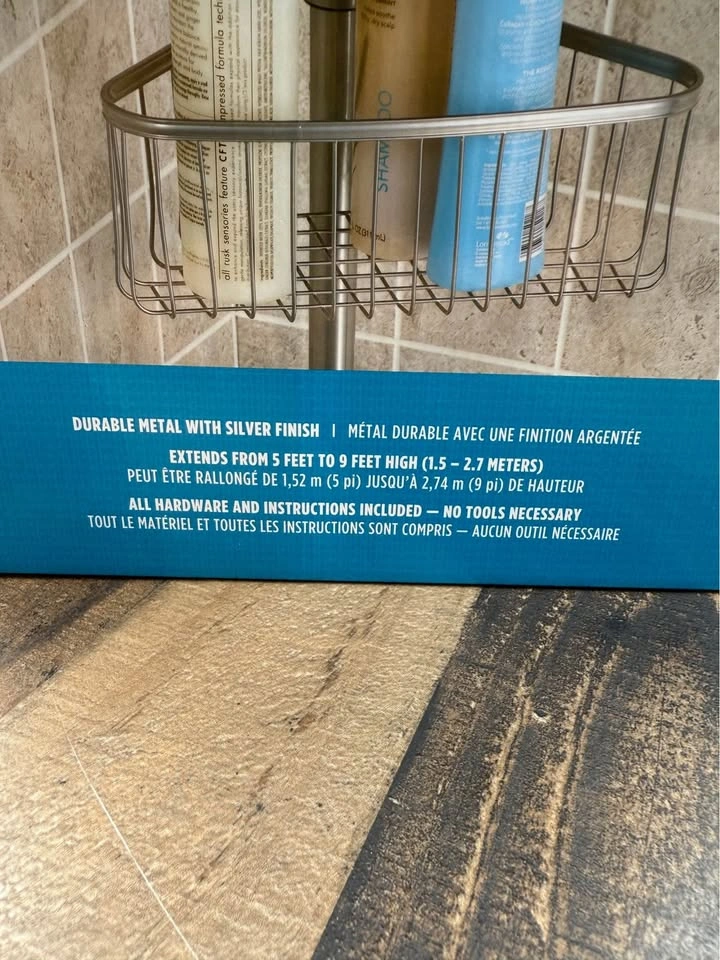 Shower Caddy Brand Name: iDesign Color: Silver Hardware included: YEs Height: 9 inch Length: 11.1 inch Material: Stainless Steel Unopened box!