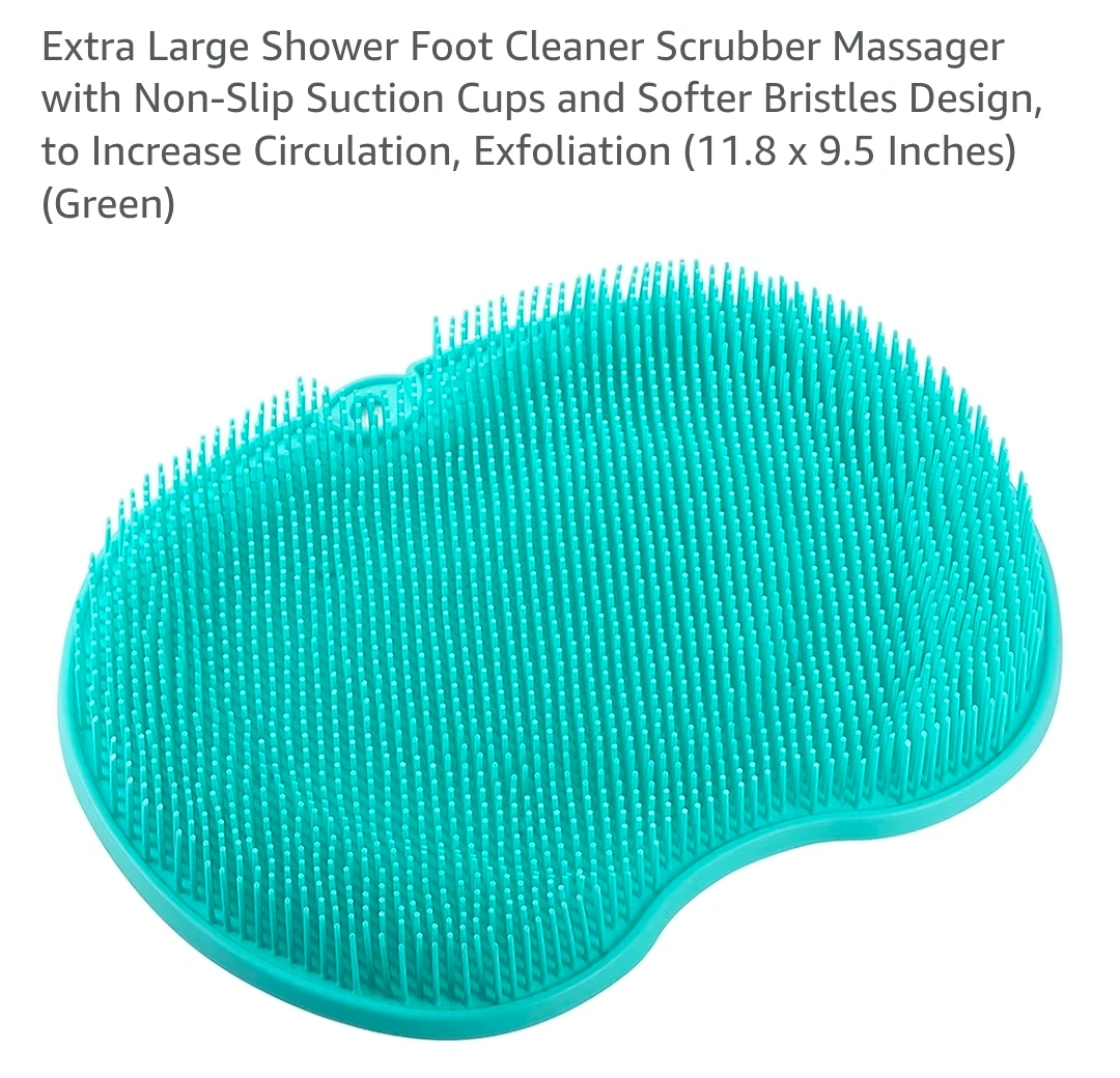 118I'm selling an extra large shower foot cleaner scrubber massager. It features non-slip suction cups and a softer bristles design to increase circulation and exfoliation. The dimensions are 11.8 x 9.5 inches, and it's green