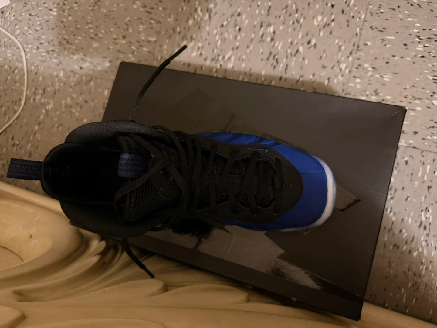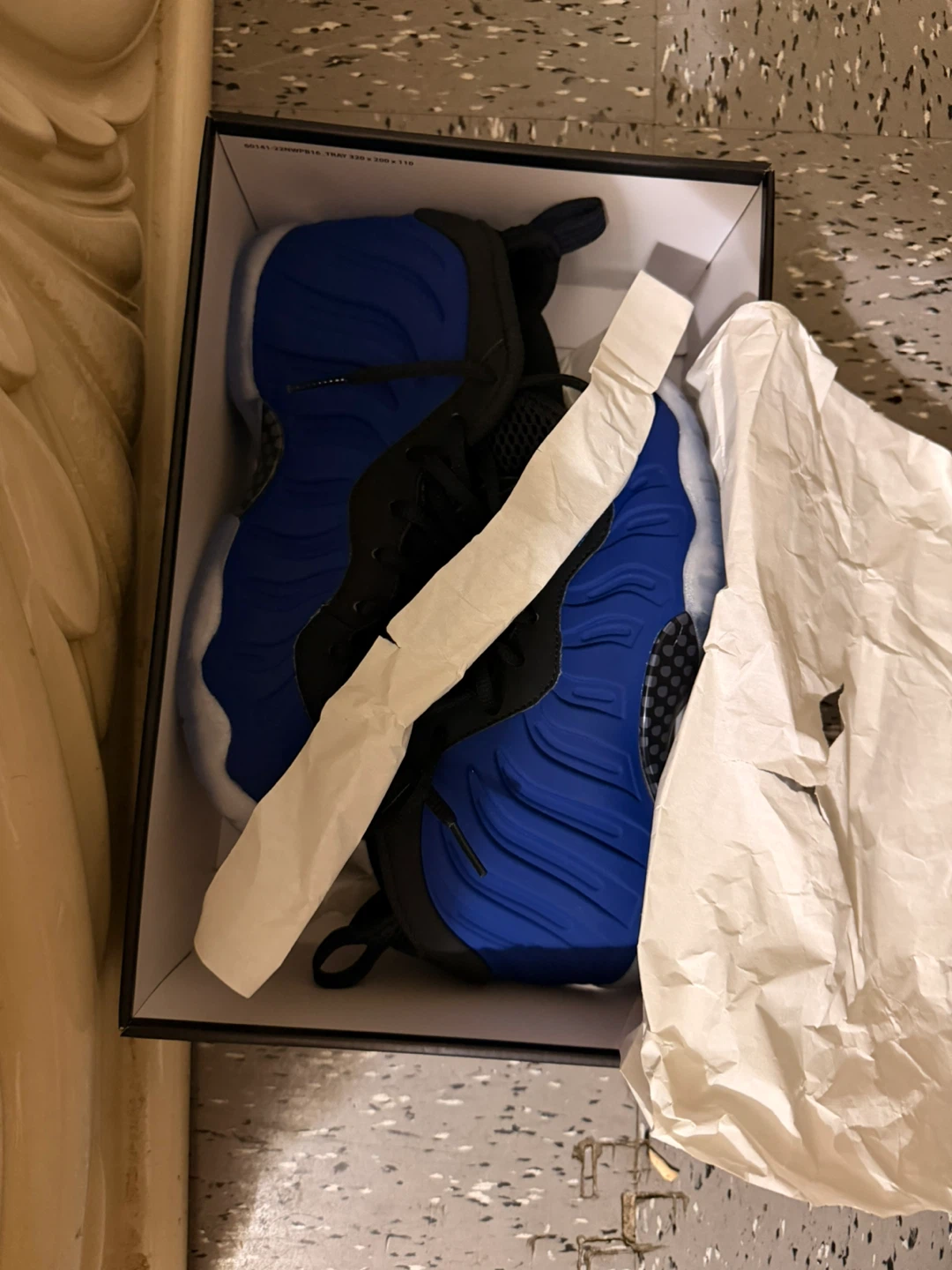 These are Nike Foamposite shoes. They're blue with black accents. Includes original box and packaging paper.