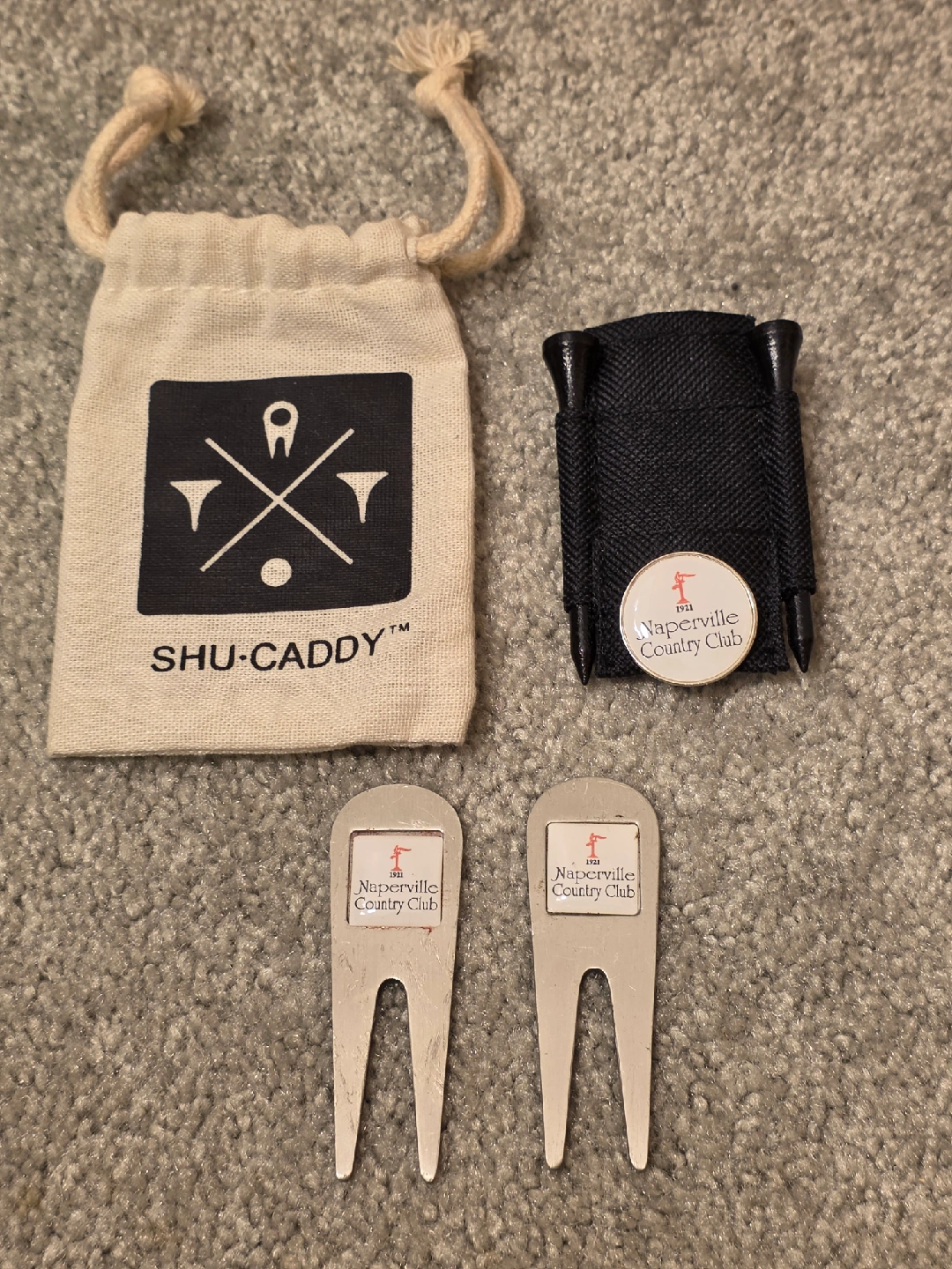 10Selling a golf accessories set that includes a Shu-Caddy bag, a black tee holder with tees, a ball marker, and two Naperville Country Club divot tools Pick up in Naperville near naper blvd and 87th street or near downtown Naperville off of Chicago and Charles
