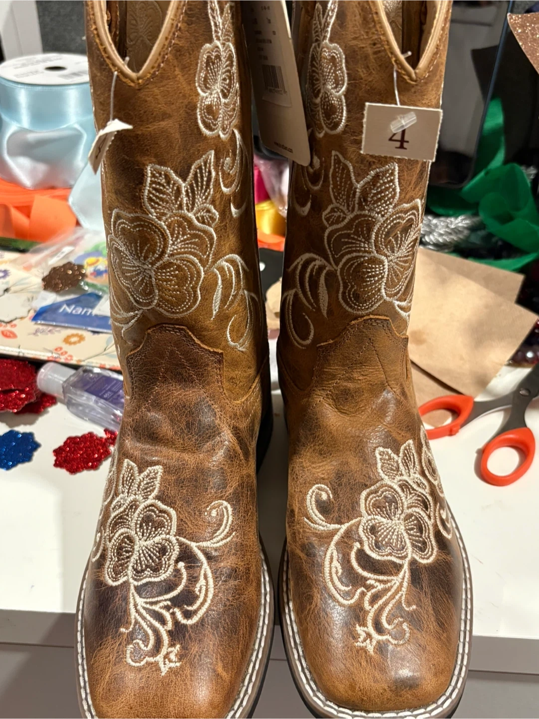 10These Shyanne cowboy boots are a beautiful brown leather with intricate white floral embroidery. They are a size 4 and perfect for adding a touch of country style to any outfit. They appear to be in great condition!