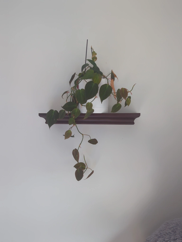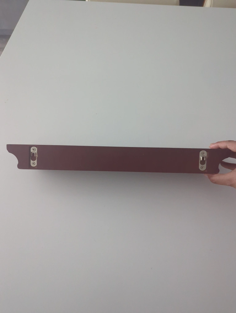 A wall shelf made of wood. Dark brown in color. Ready to be hanged. You can use it to put your favorite plant, candles, or books for a nice atmosphere. Never used!