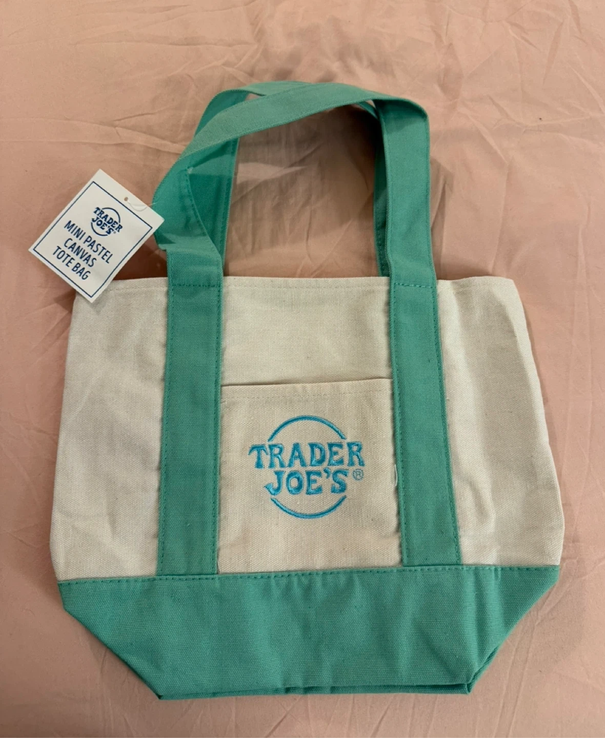 Trader Joe's mini canvas tote bag. Features pastel teal accents and handles. It has a small front pocket with the Trader Joe's logo embroidered on it. A handy little bag for everyday essentials!