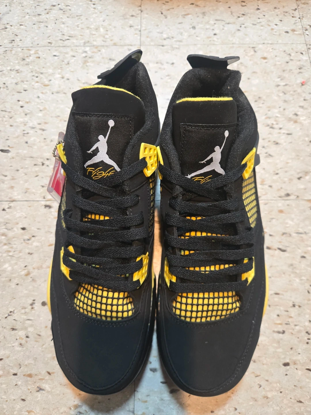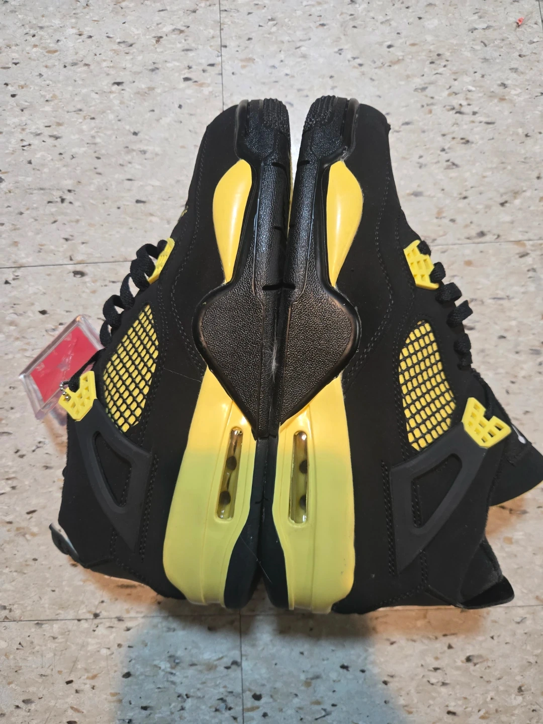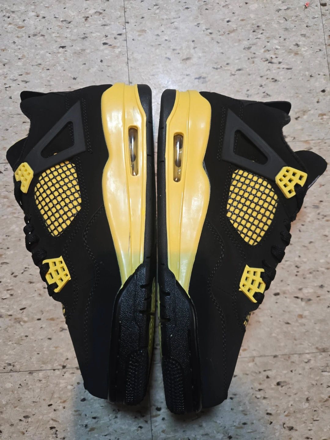 Black and yellow Air Jordan 4 "Lightning" sneakers. Features visible Air units in the sole and classic Jumpman branding. Durable construction for everyday wear.