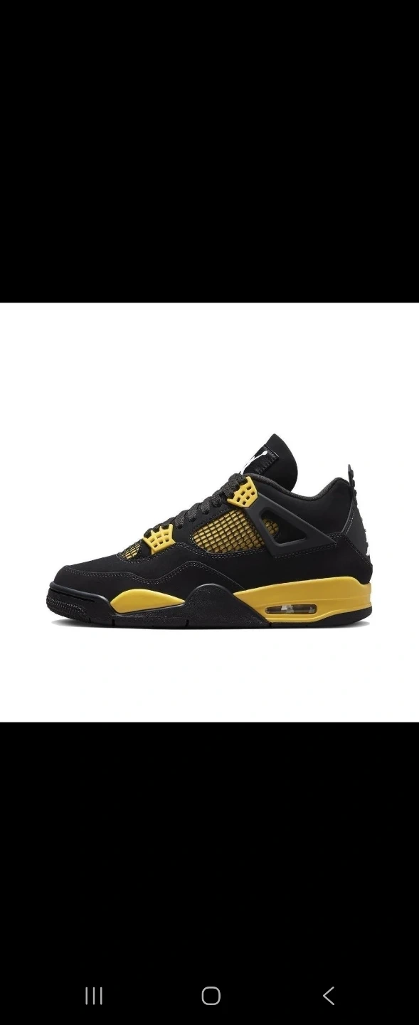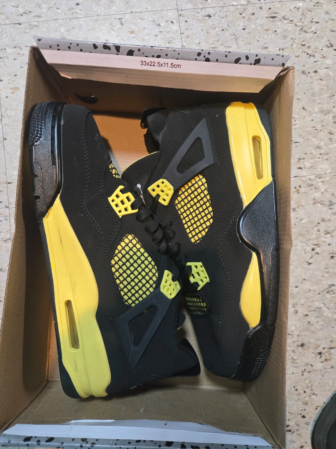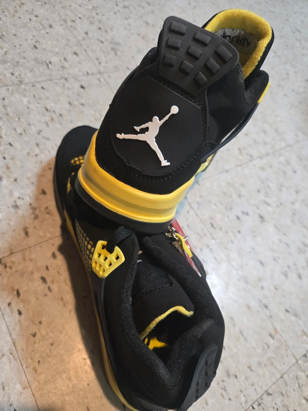Black and yellow Air Jordan 4 "Lightning" sneakers. Features visible Air units in the sole and classic Jumpman branding. Durable construction for everyday wear.