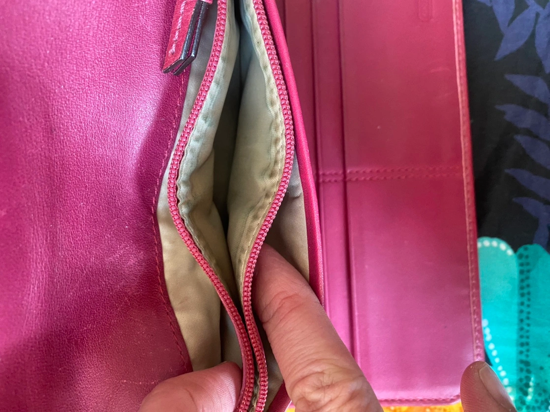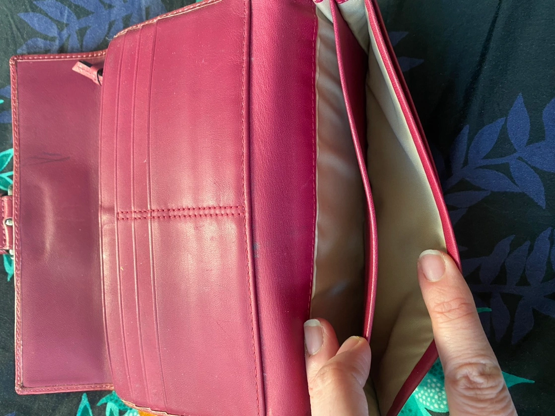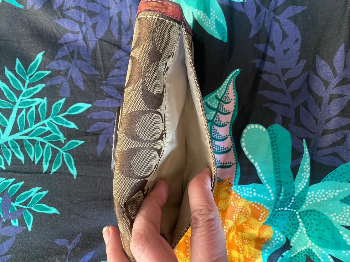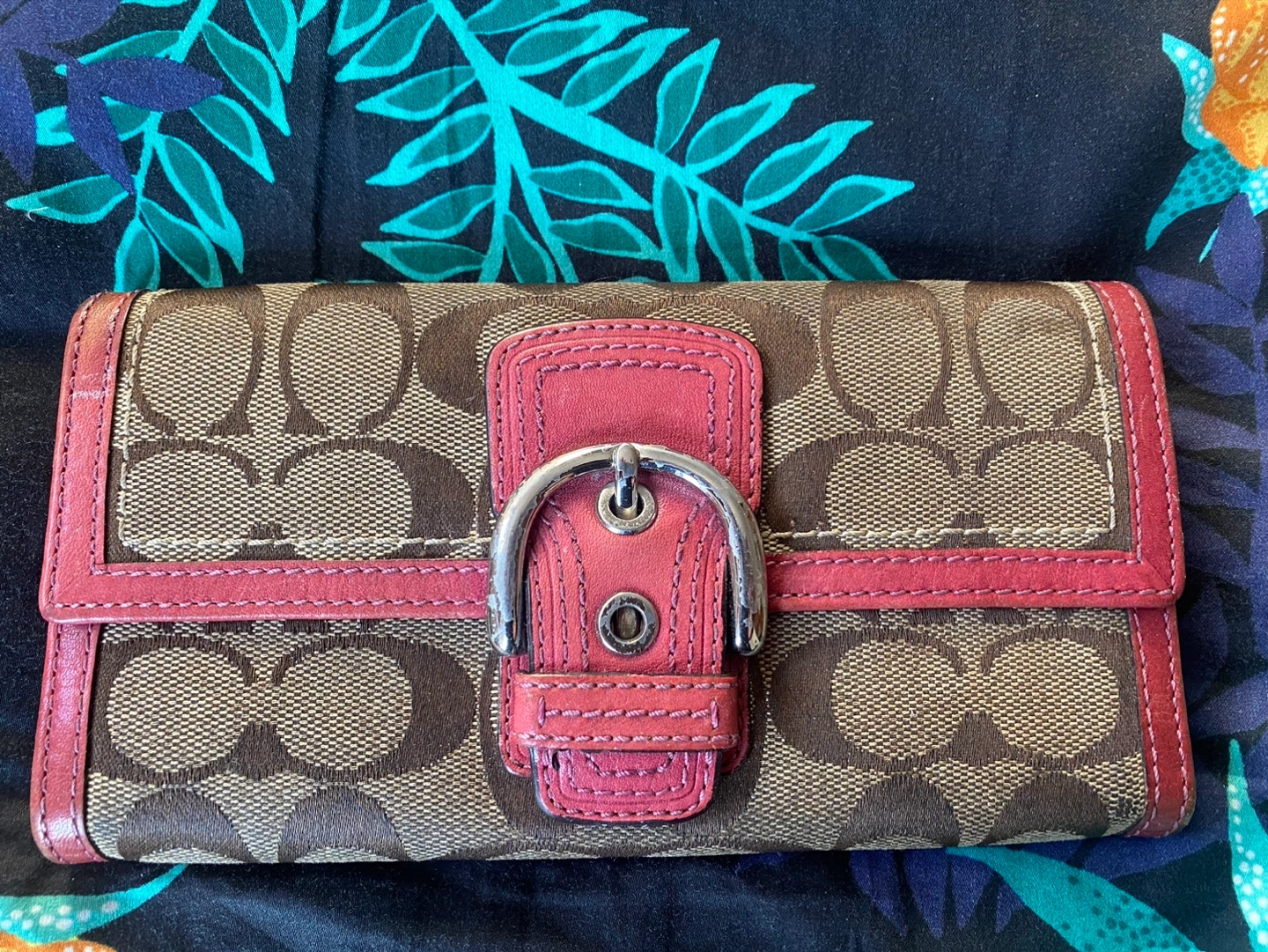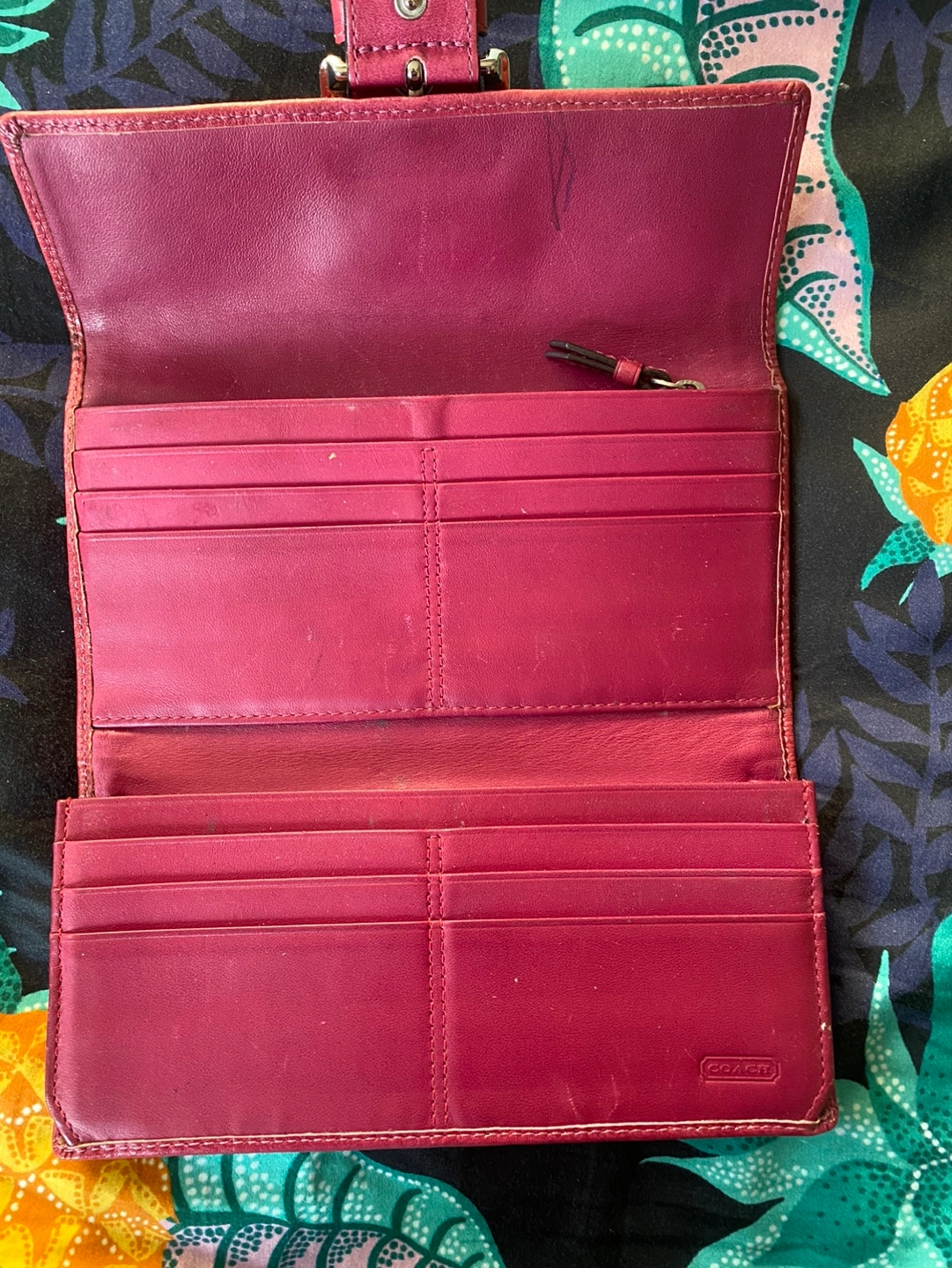 81Dark pink, leather and canvas buckle front vintage coach trifold wallet Absolutely nothing wrong with it. Just needs a good cleaning. Gently used