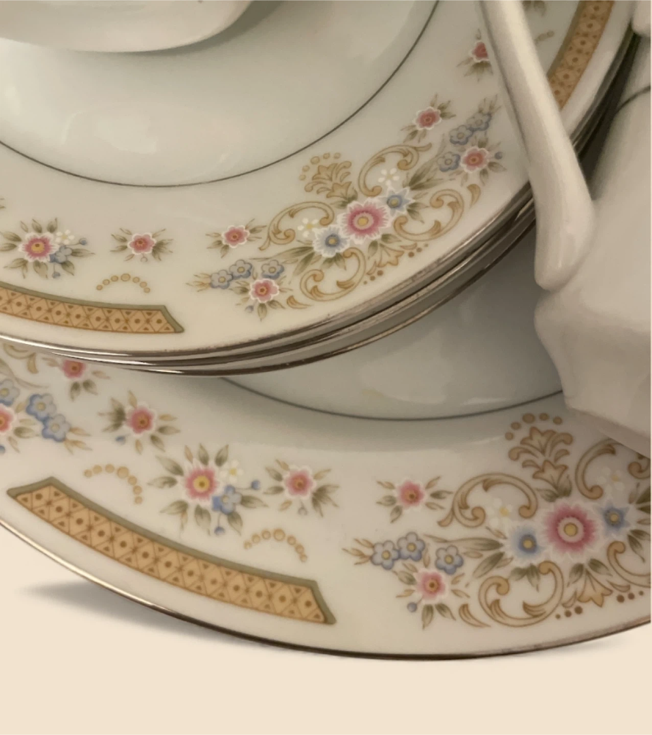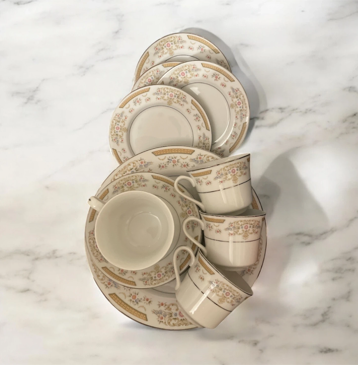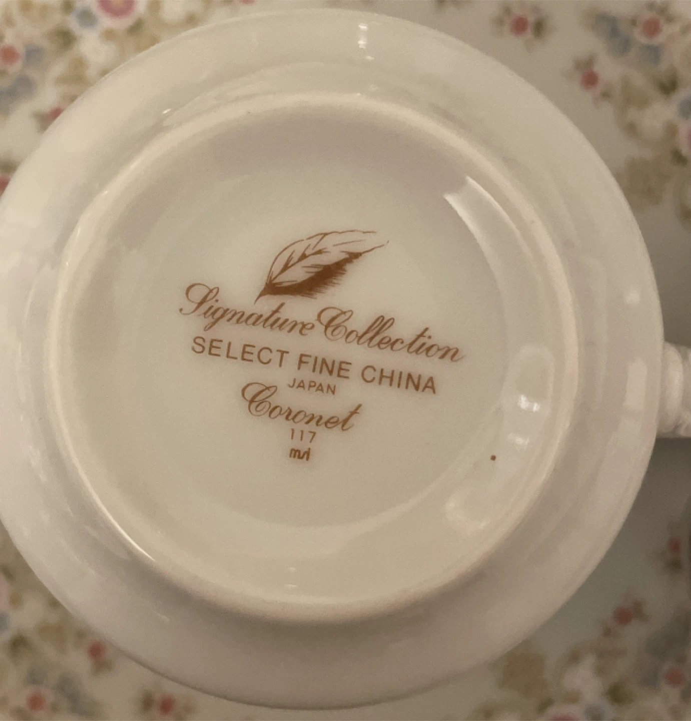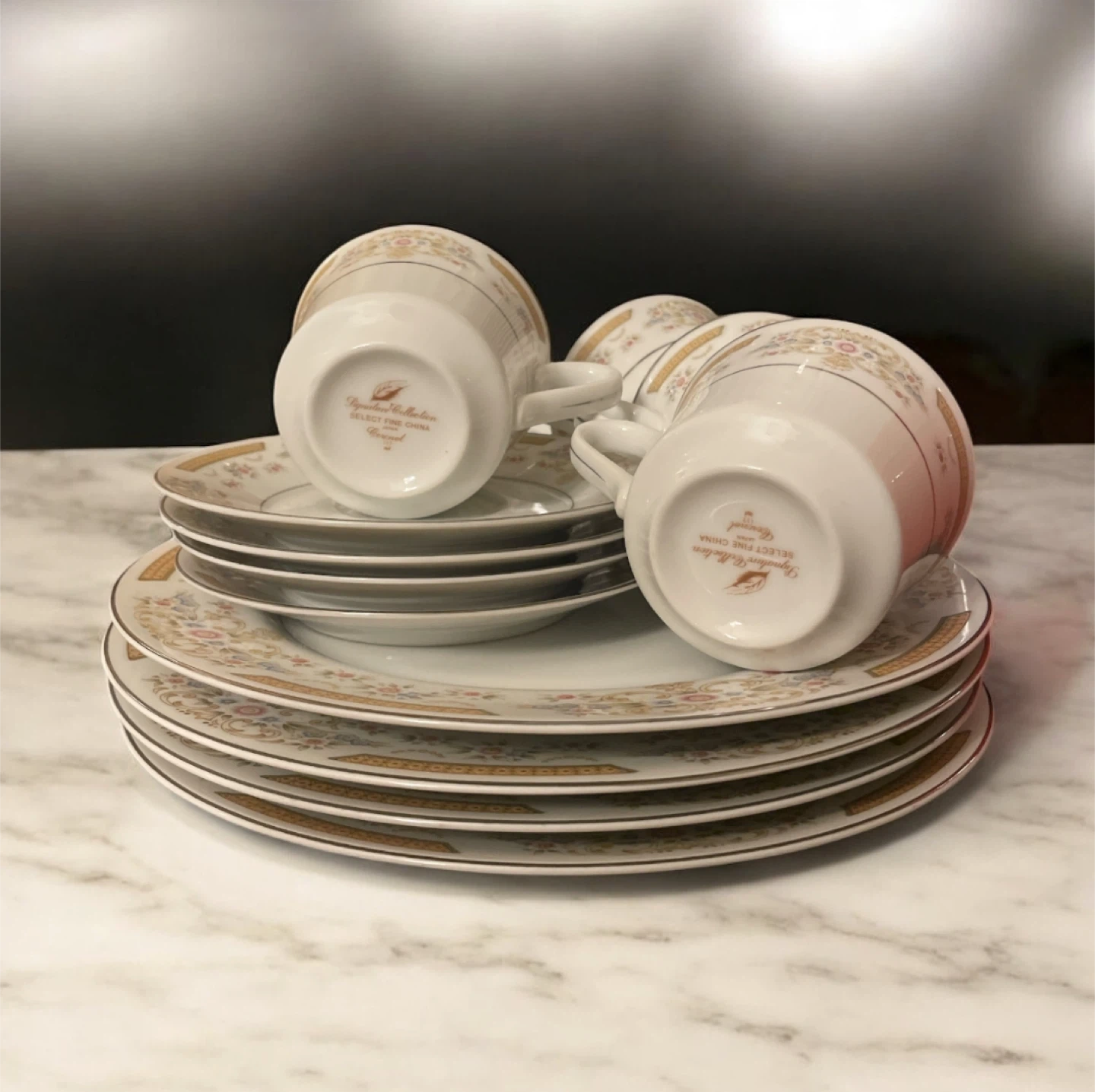 23The product is a set of 4 each, teacup, saucer, cake plate and dinner plates from the Signature Collection, "Coronet" pattern, by Select Fine China of Japan. This is a fine china dinnerware set with a floral design. The pattern features delicate sprays of pink and blue roses with a fluted edge trimmed in platinum. It is described as being dishwasher safe. The manufacturer, Select Fine China, is a brand associated with Noritake.