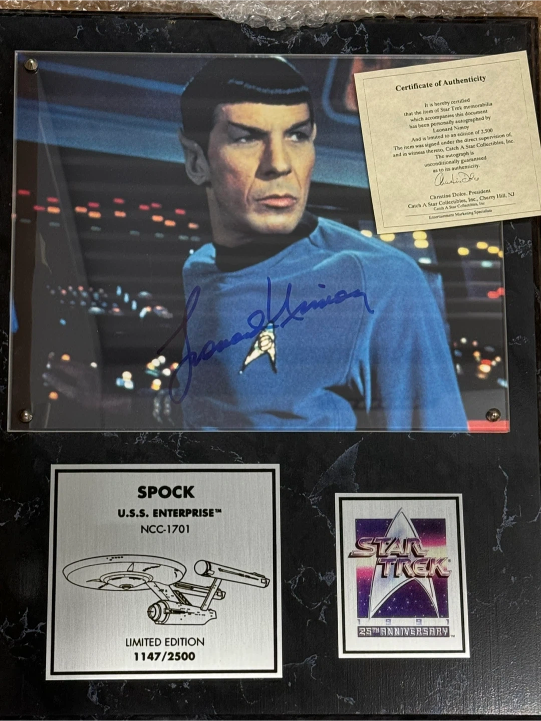10Selling a framed piece of Star Trek memorabilia featuring an autographed photo of Leonard Nimoy as Spock. It comes with a certificate of authenticity from Catch A Star Collectibles, Inc. This is a limited edition item, numbered 1147 out of 2500. A great piece for any Star Trek fan!