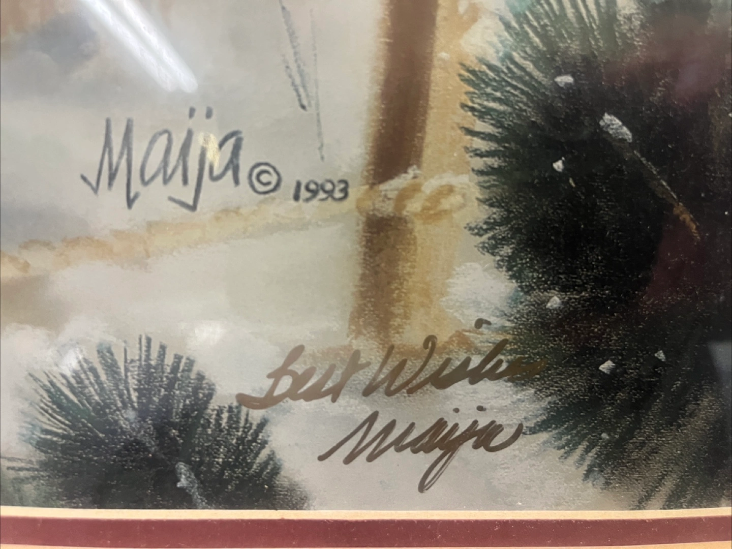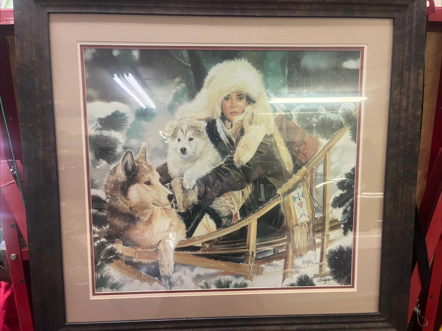 Framed art print featuring a person with two dogs. The artist signed the print along with a message and dated it 1993. Placing this art in your home would bring a sense of peace to any room.