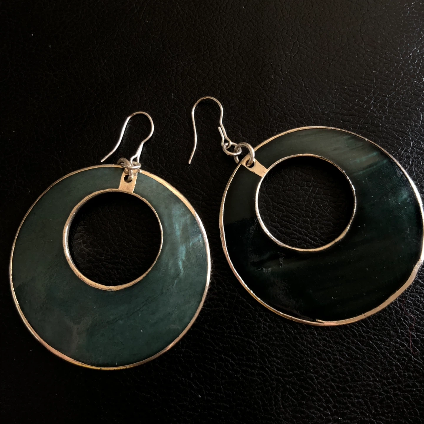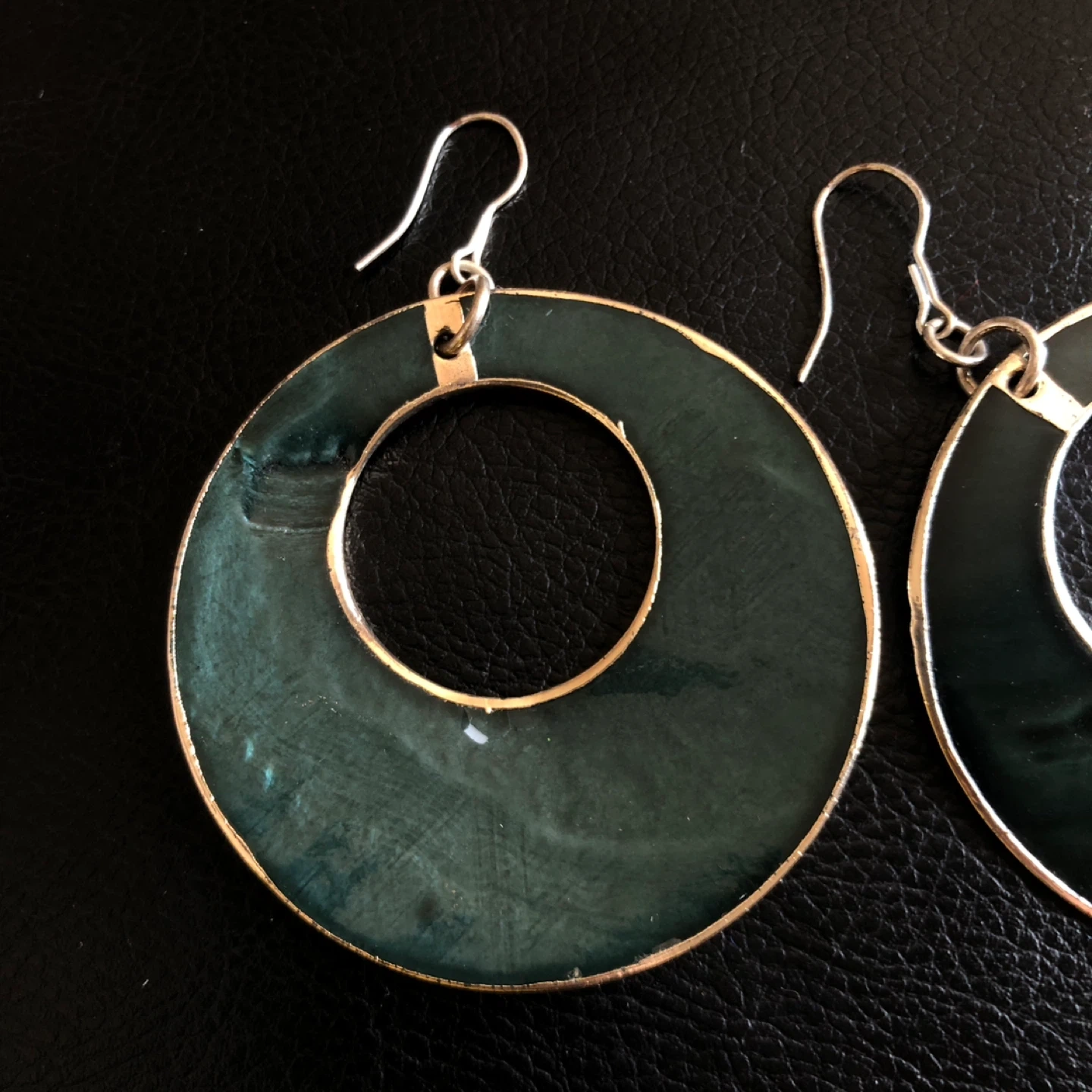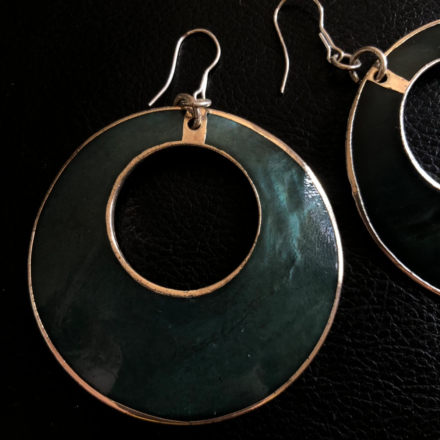 These large hoop earrings have a dark teal, iridescent inlay. They feature a gold-tone metal trim and ear hooks. A unique statement accessory!