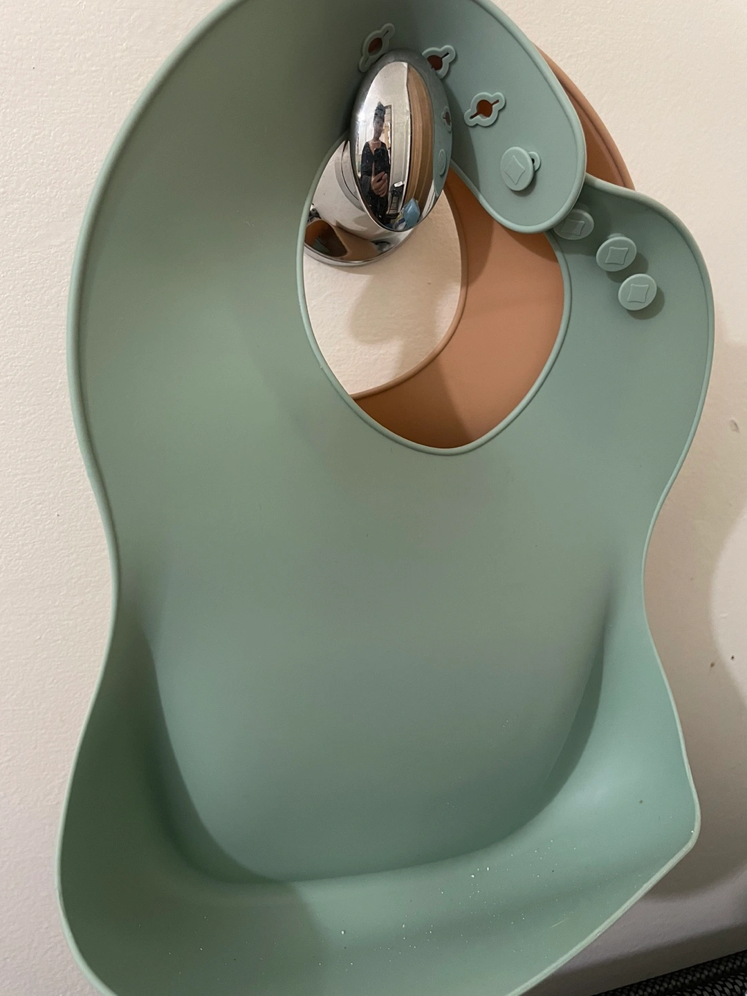 2 Soft silicone baby bib. Easy to clean. Mint green color. Has a pocket to catch food.