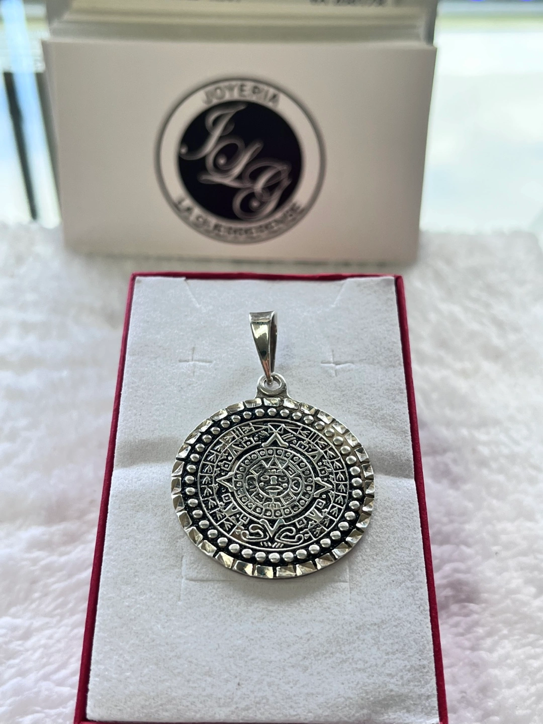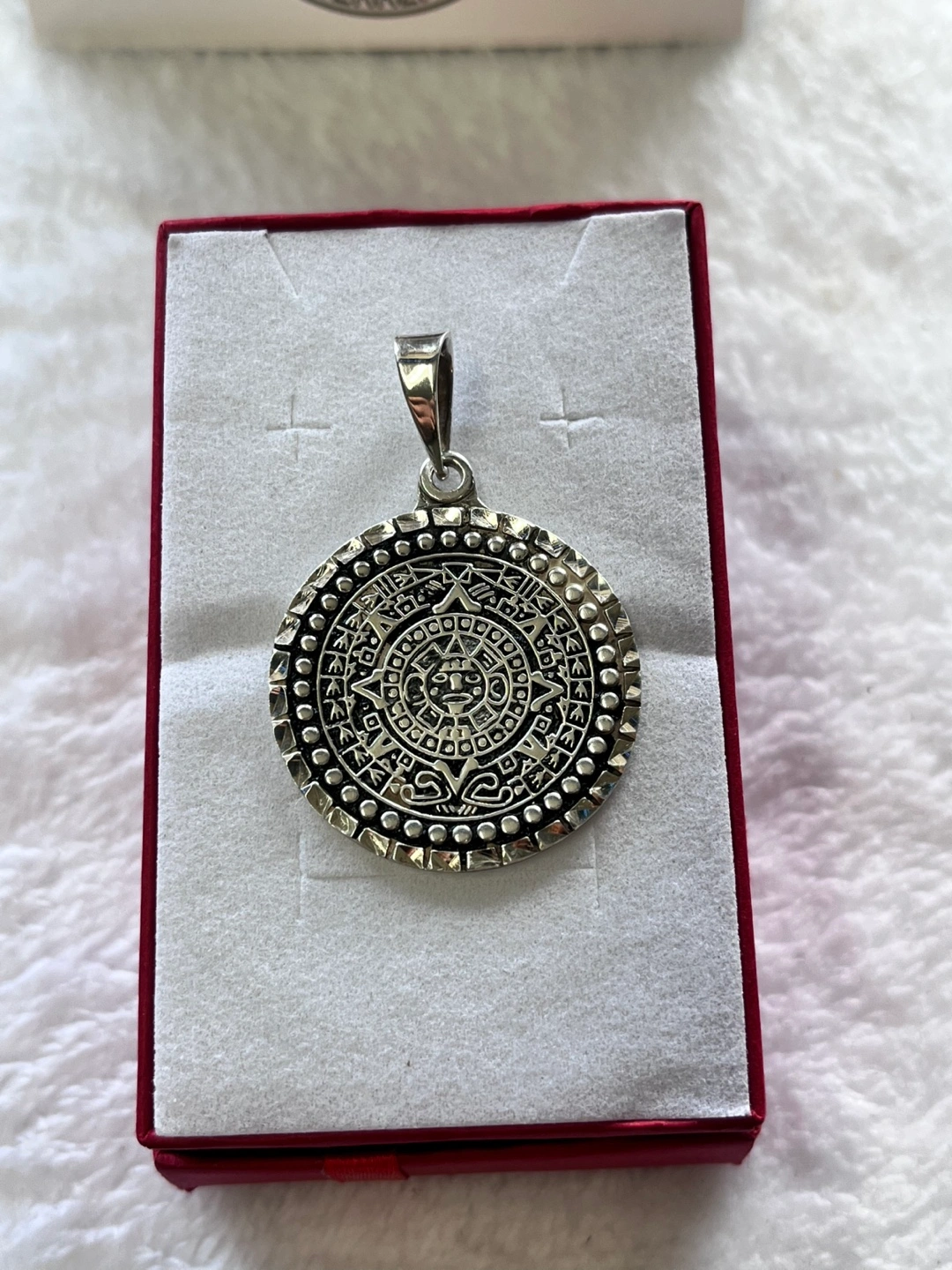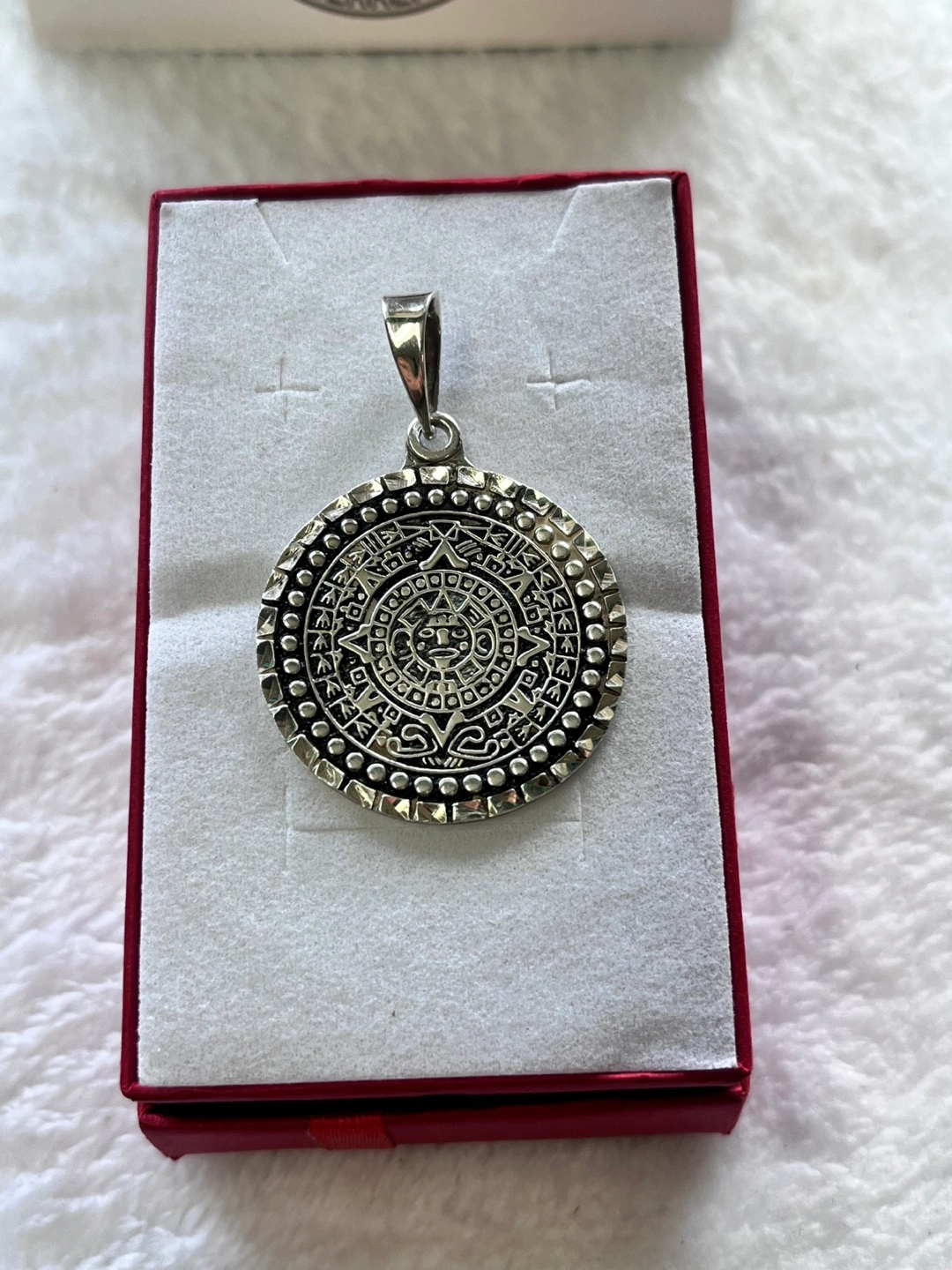 65Selling a beautiful silver 9.25 Aztec calendar pendant. It comes in a box and is in great condition! Perfect for anyone interested in Aztec culture or unique jewelry medalla calendario azteca plata 9.25 de Taxco