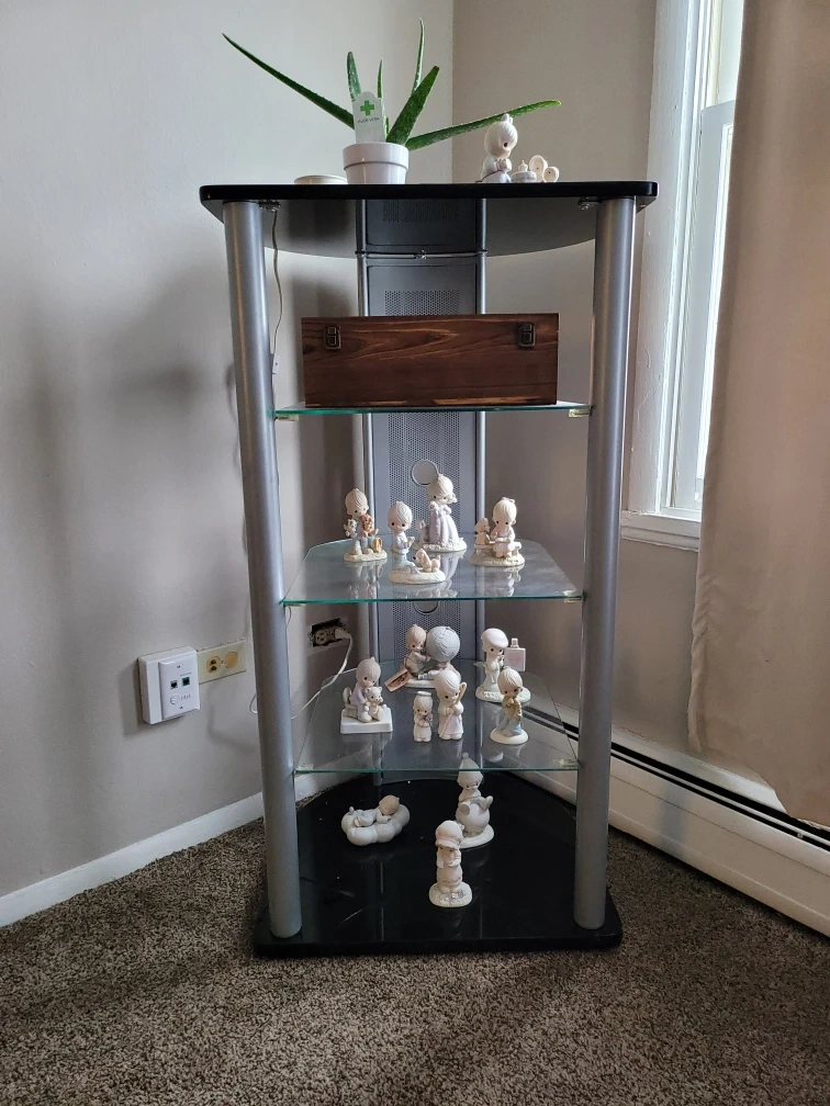 60Selling a shelf unit with a silver frame and black and glass shelves. It's in good condition and perfect for displaying collectibles or storing items