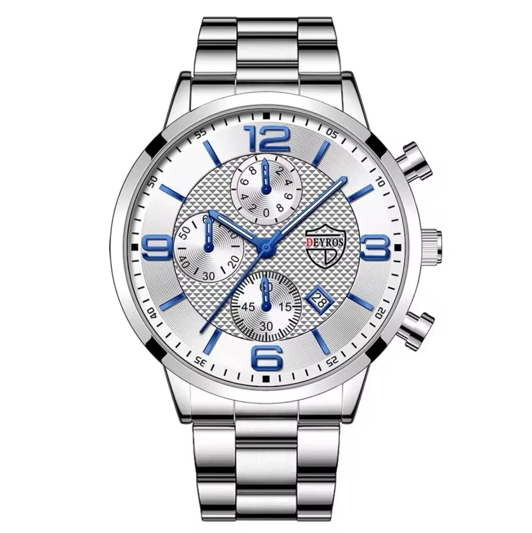 10This stylish chronograph watch features a silver case, blue accents, and a sleek metal band. With three sub-dials, a date window, and bold numerals, it offers both function and flair. Powered by quartz movement, it delivers precise timekeeping without relying on hand motion. Its lightweight design ensures all-day comfort, making it ideal for everyday wear.