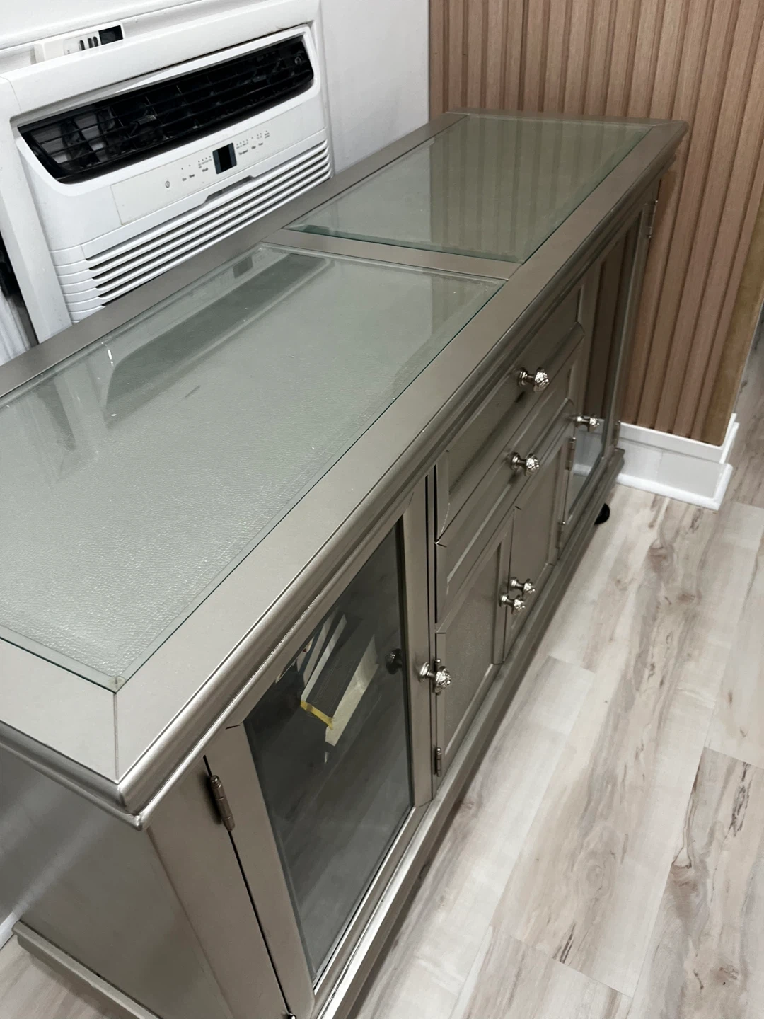 Selling a stylish silver console table with a glass top! It features drawers and glass-door cabinets, perfect for storage and display. The table is in good condition and would look great in any living room or entryway