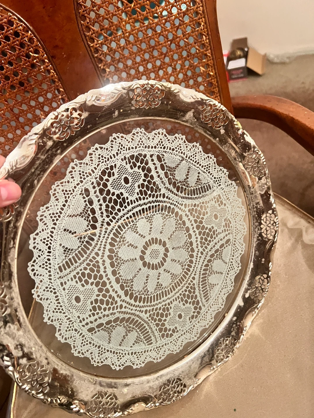 103Selling a beautiful silver tray featuring a delicate lace design. It's in great condition and would make a lovely addition to any home decor!