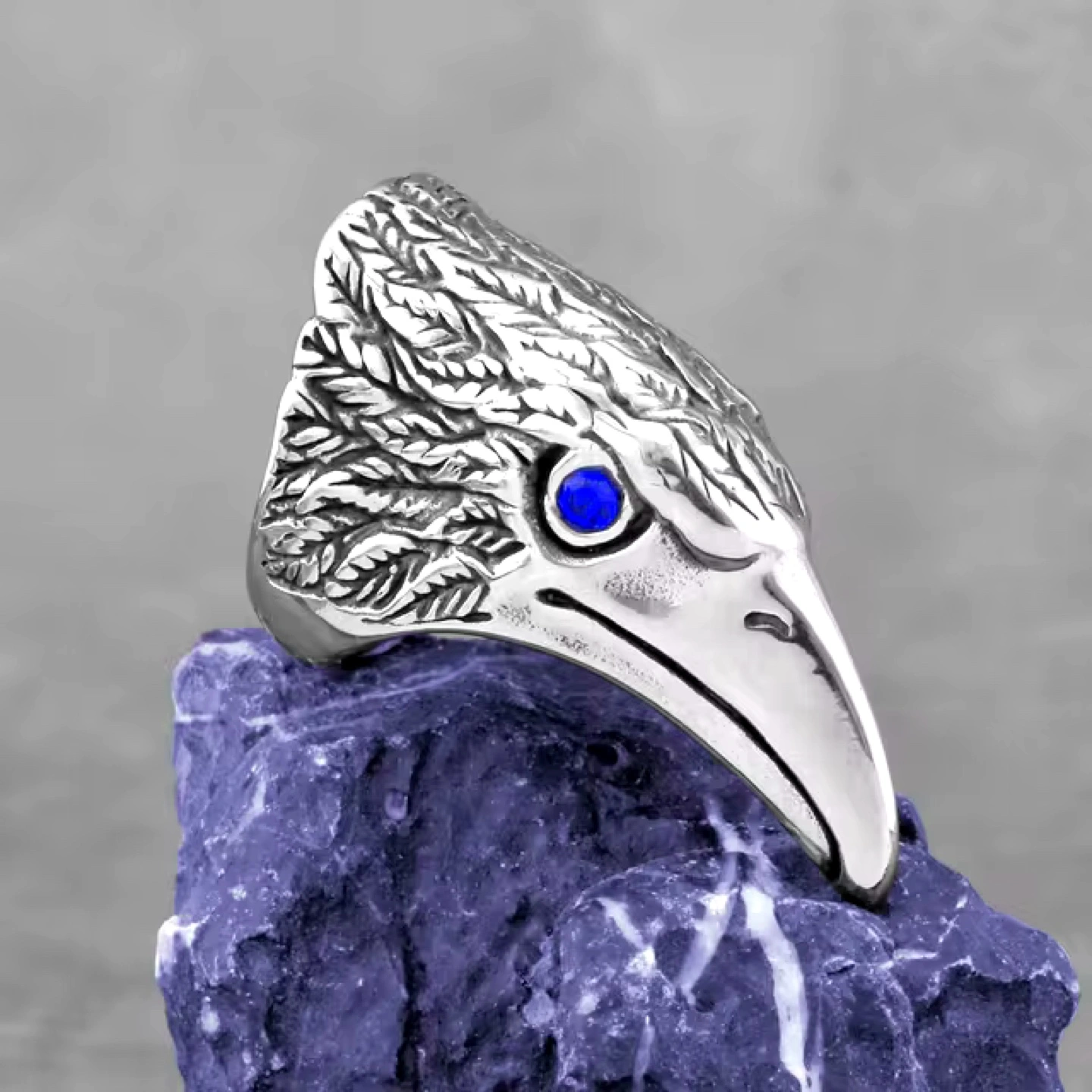 Silver ring with detailed eagle head design. Features a blue stone in the eye.