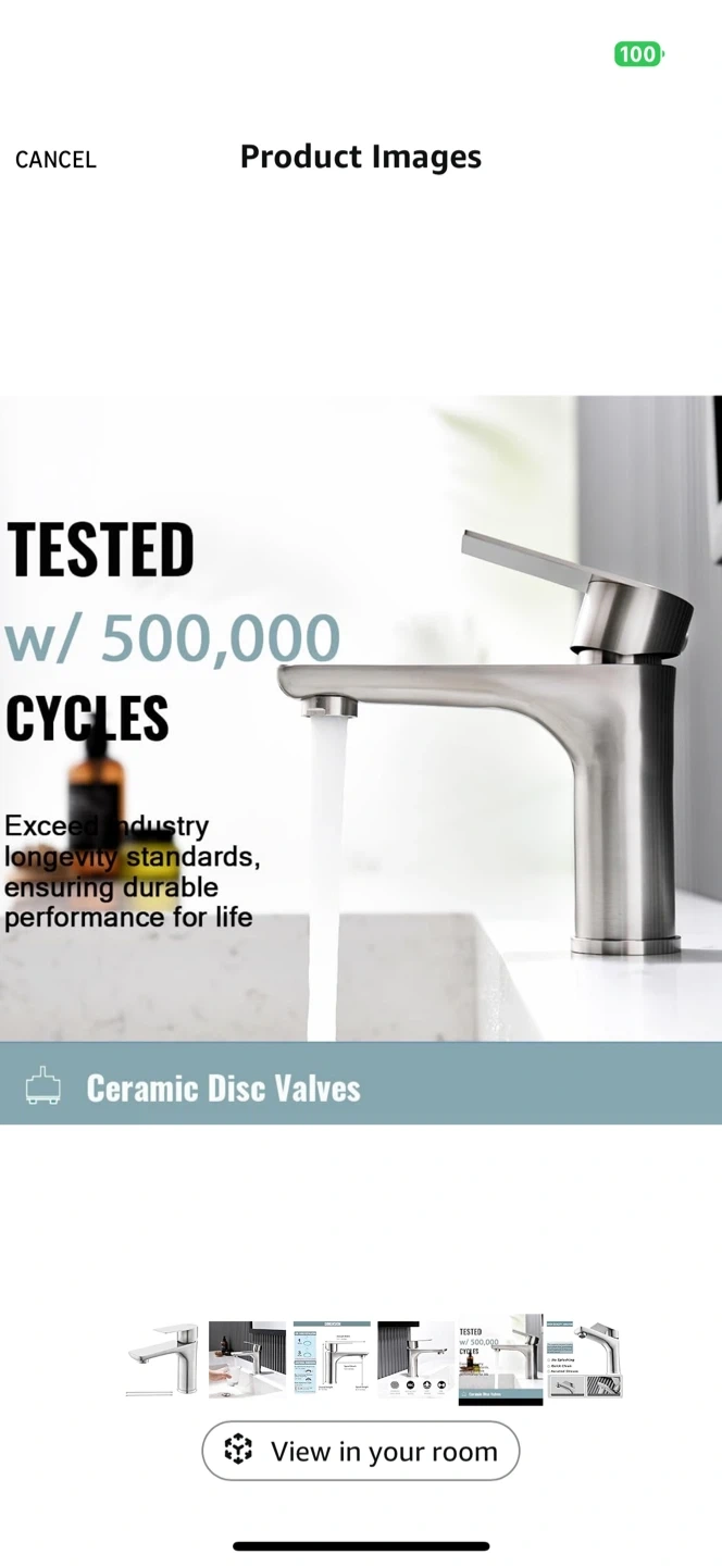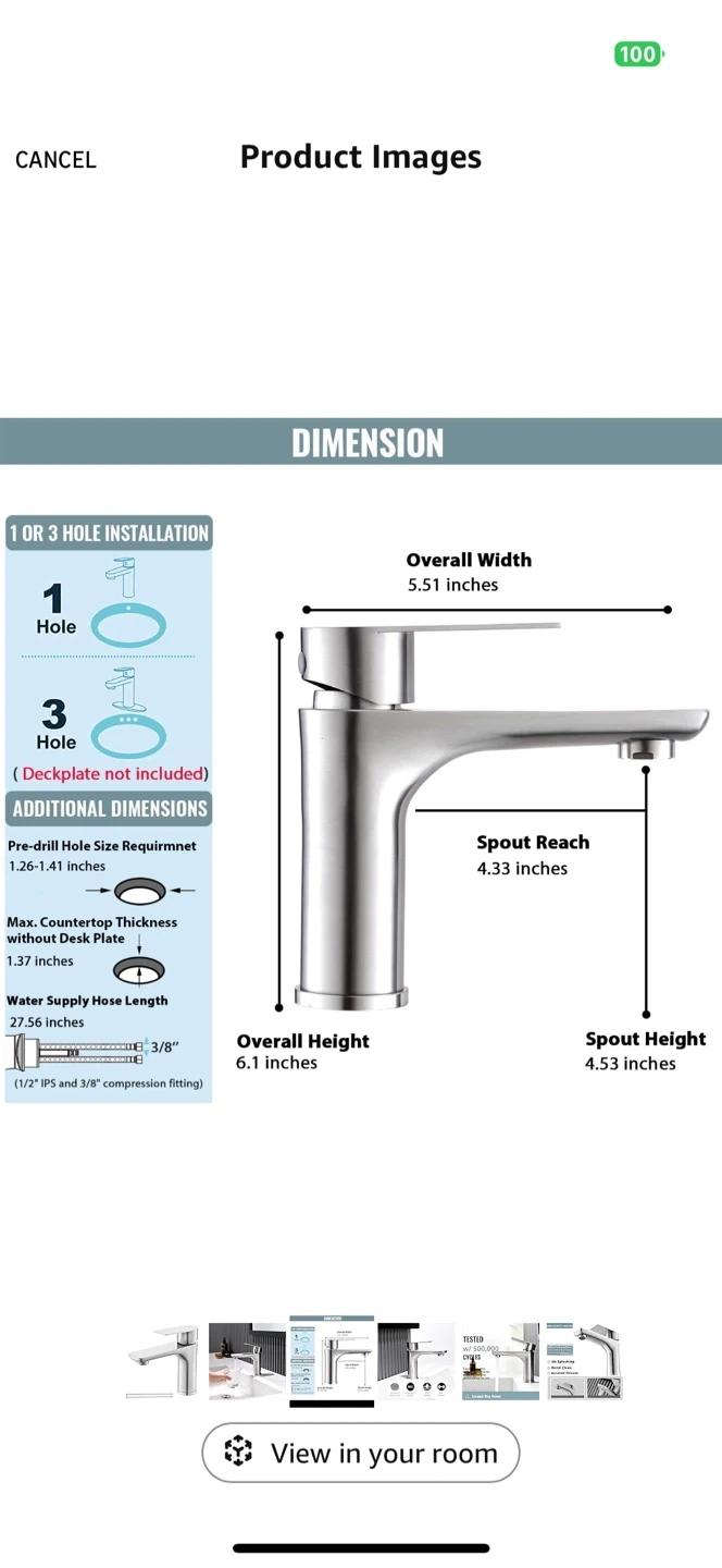 10This bathroom sink faucet has a sleek silver finish! It's been tested with 500,000 cycles, ensuring durable performance. It features ceramic disc valves, a stainless steel hose, and is designed to save water. It's a one-handle design for ease of use. The dimensions are: - Overall width: 5.51 inches - Spout reach: 4.33 inches - Overall height: 6.1 inches - Spout height: 4.53 inches