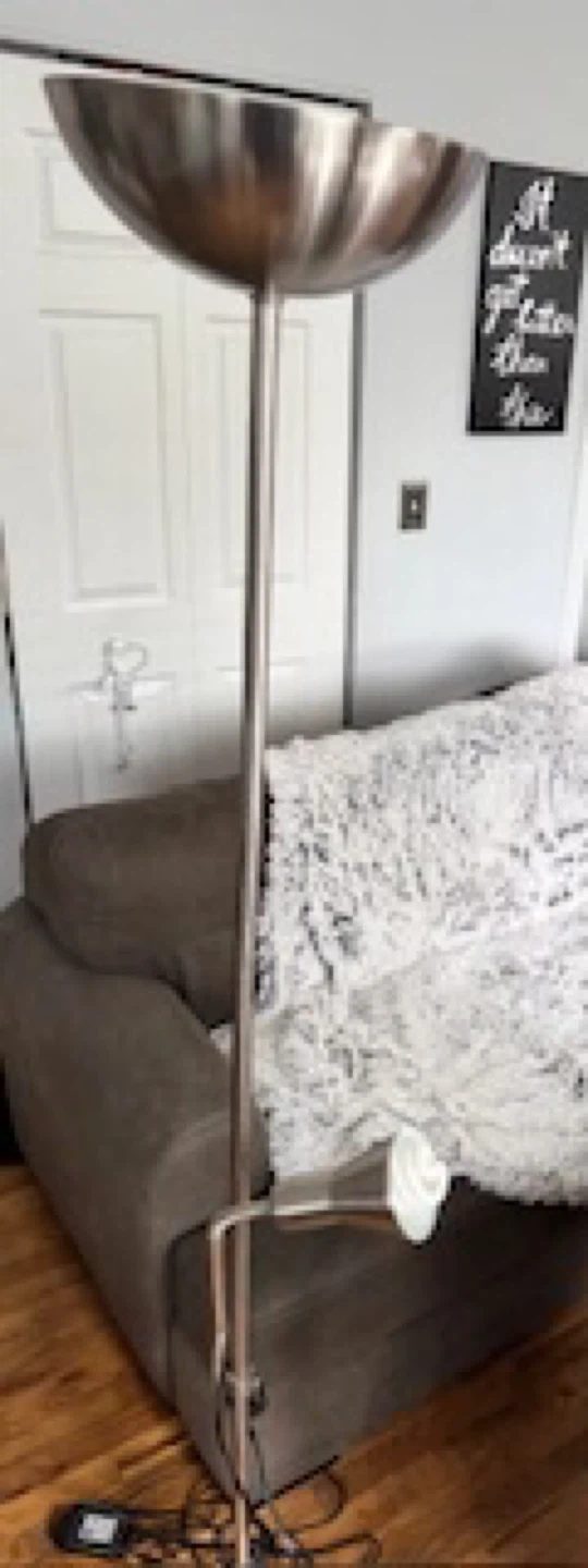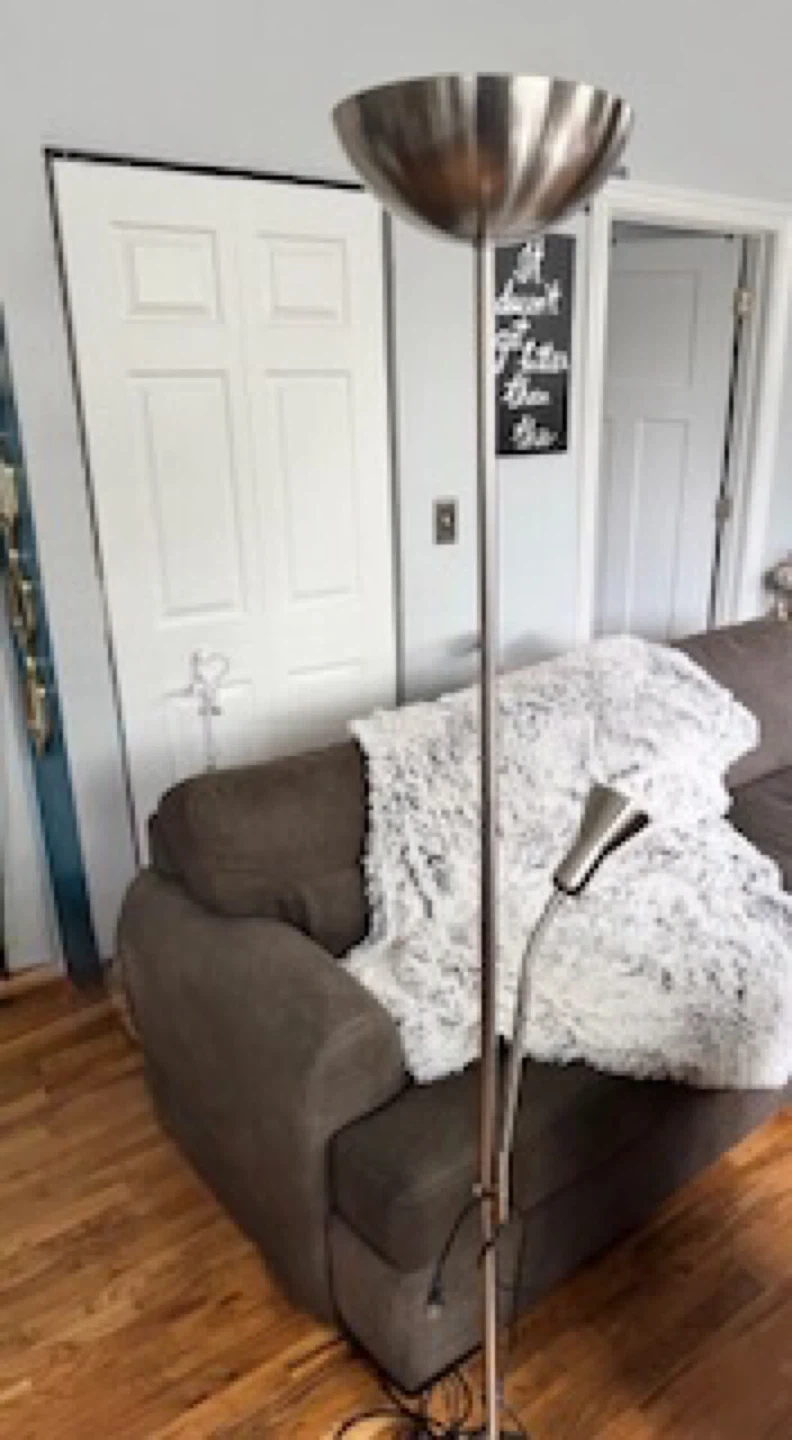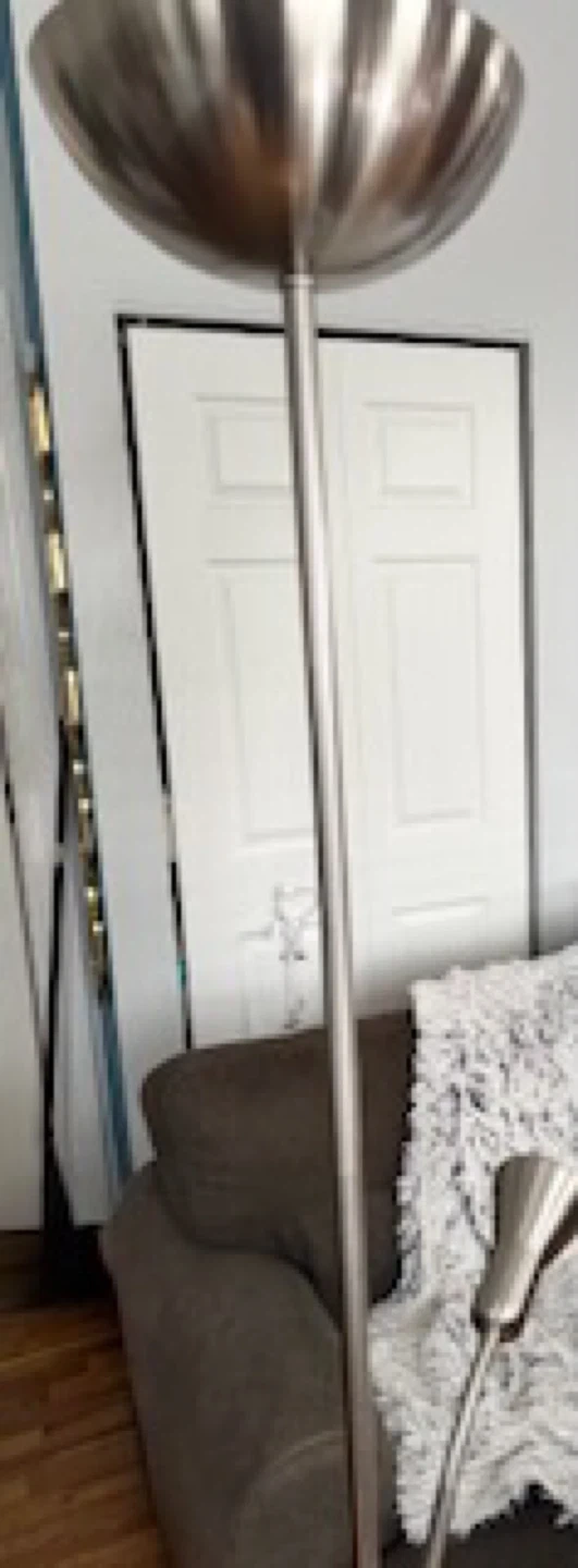 If you are reading this listing item is available. Item will be removed once item is Sold.Message me when you’re ready to arrange pickup. Thanks Selling a silver floor lamp that comes with an adjustable reading light. It has a bowl-shaped shade and a circular base. There are some signs of wear on the base. Lamp has some damage to base during moving but works & still looks great would really have to get up close to see it. Sofa also available check out my other items on the listings thanks Tags postmodern mcm mod modern minimalist chiclet chair parsons chair milo baughman thayer coggin memphis chair print chairs arm chairs club chairs lounge chairs vintage retro chairs vintage furniture vintage sofa vintage couches loveseat couch moving sale vintage table antique furniture Antique table Antique chairs vintage lamps sofa table cocktail table coffee table curved sofa curved loveseat curved couches paisley chairs paisley print sofa paisley couch comfy sofa chase lounge ottoman barstools round dining table dining chairs dining table solid wood furniture Chase lounge sofa, Dining Sets, Ottomon Vintage,Solid Wood,Mitchell Gold Bob Williams, MG+BW, Crate & Barrel, West Elm, DWRm Design Within Reach, Pottery Barn, RH, Restoration Hardware, CB2, Modern, Contemporary, Industrial, Z Gallerie, Arhaus, Pier 1, Walter E. Smithe, Overstock, Wayfair, Anthropologie, Loft, Howell Chairs, howell chair, Howell kitchen chairs, Howell dining chair, black vinyl, wood chairs, Metal chairs,Vintage 1975 Barrel Leather Chairs, Walter E. Smiths, Nathan James, KLER, CANVAS PRINTS OF ROME ITALY-THE COLISEUM, THE TREVI FOUNTAIN, Glass Dining Table, Floor Lamp, Reading Lamp, Black Leather Dining Chairs, writer’s Desk, Scandinavian Wood Desk, Contemporary Desk,Baby rocking chair, lounger chair, lounging chairs, slipper chairs, Lazy Boy Chair, Lazyboy ,Recliner Chair, Reclining Chair, Nursery furniture, microseal protector, Furniture.