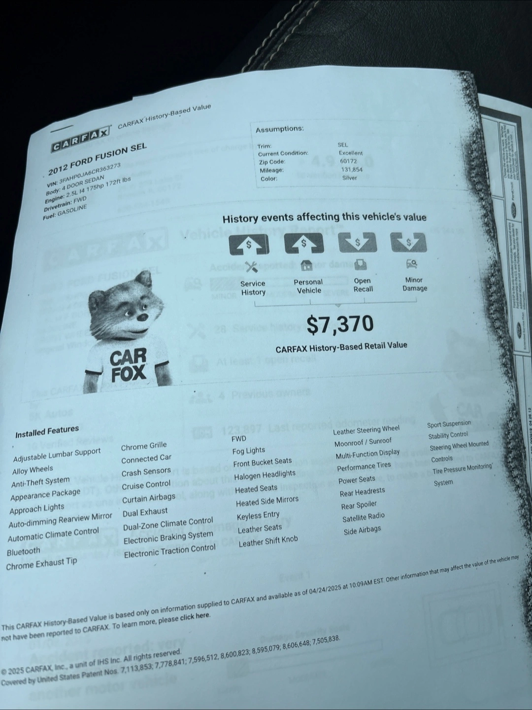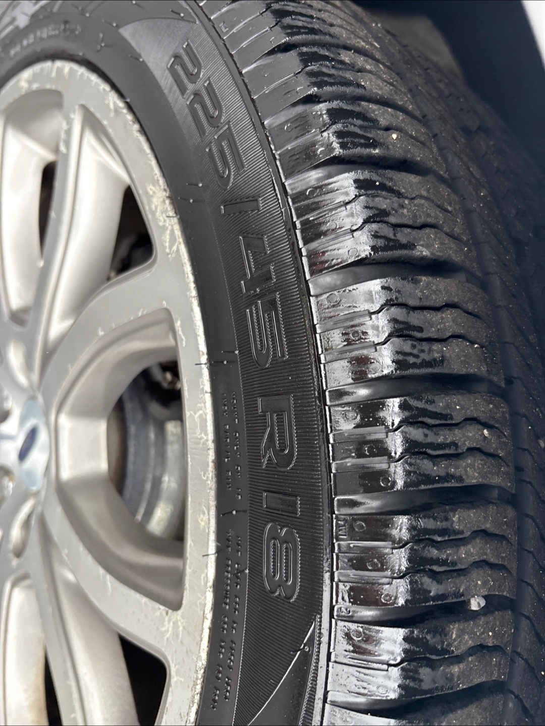 Selling a used silver Ford Fusion sedan. The tires are size 225/45R18. It has some wear and tear, but is still in good condition.
