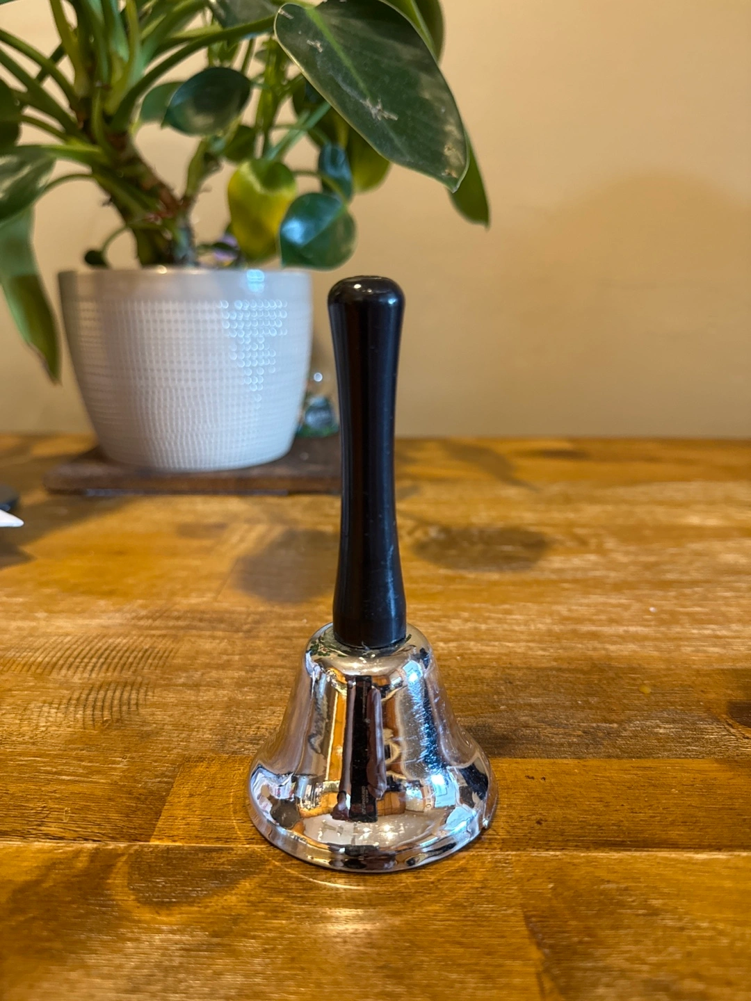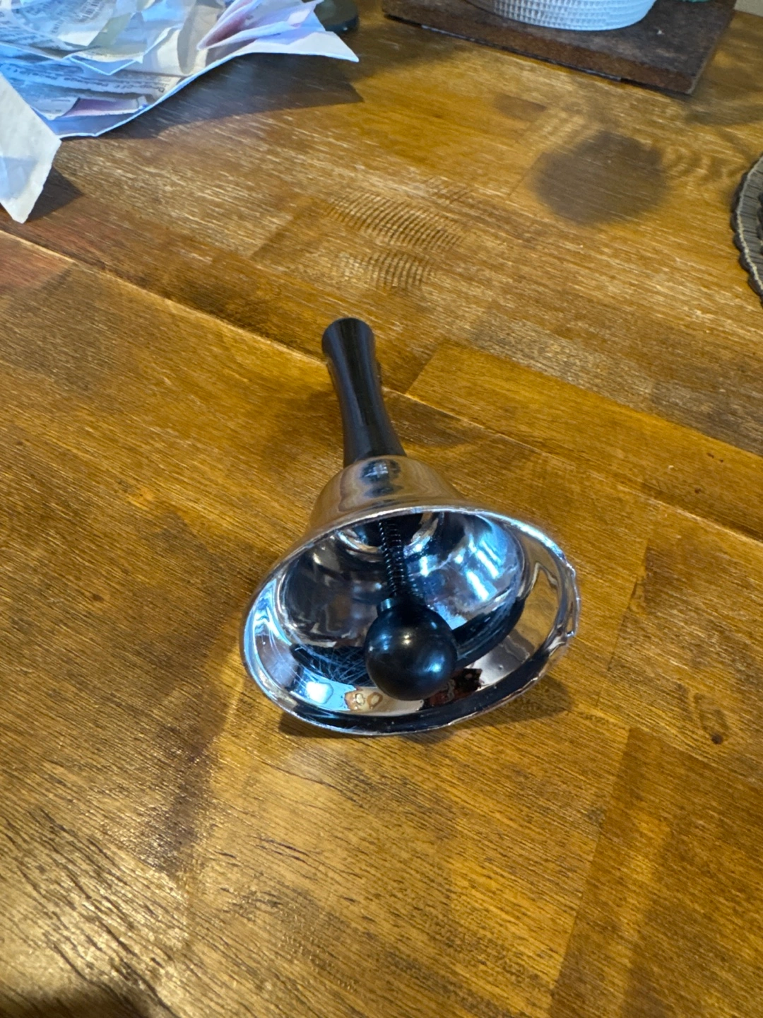 Selling a silver handbell. It's in good condition and makes a nice ringing sound. Great for events, celebrations, or just for fun!