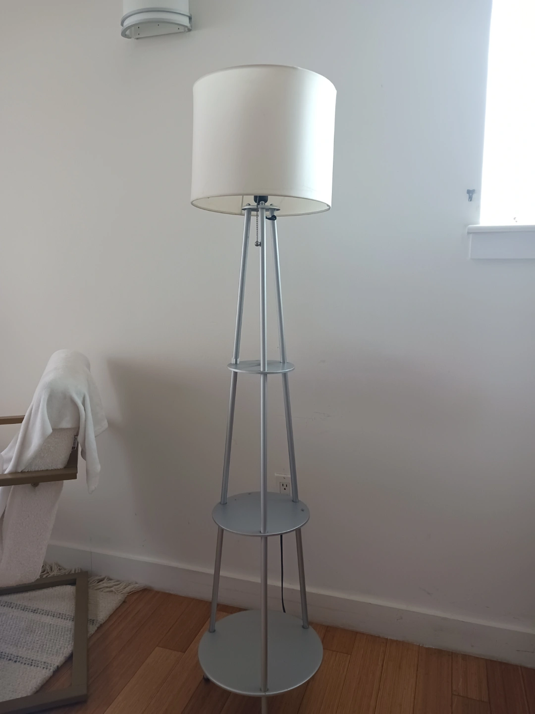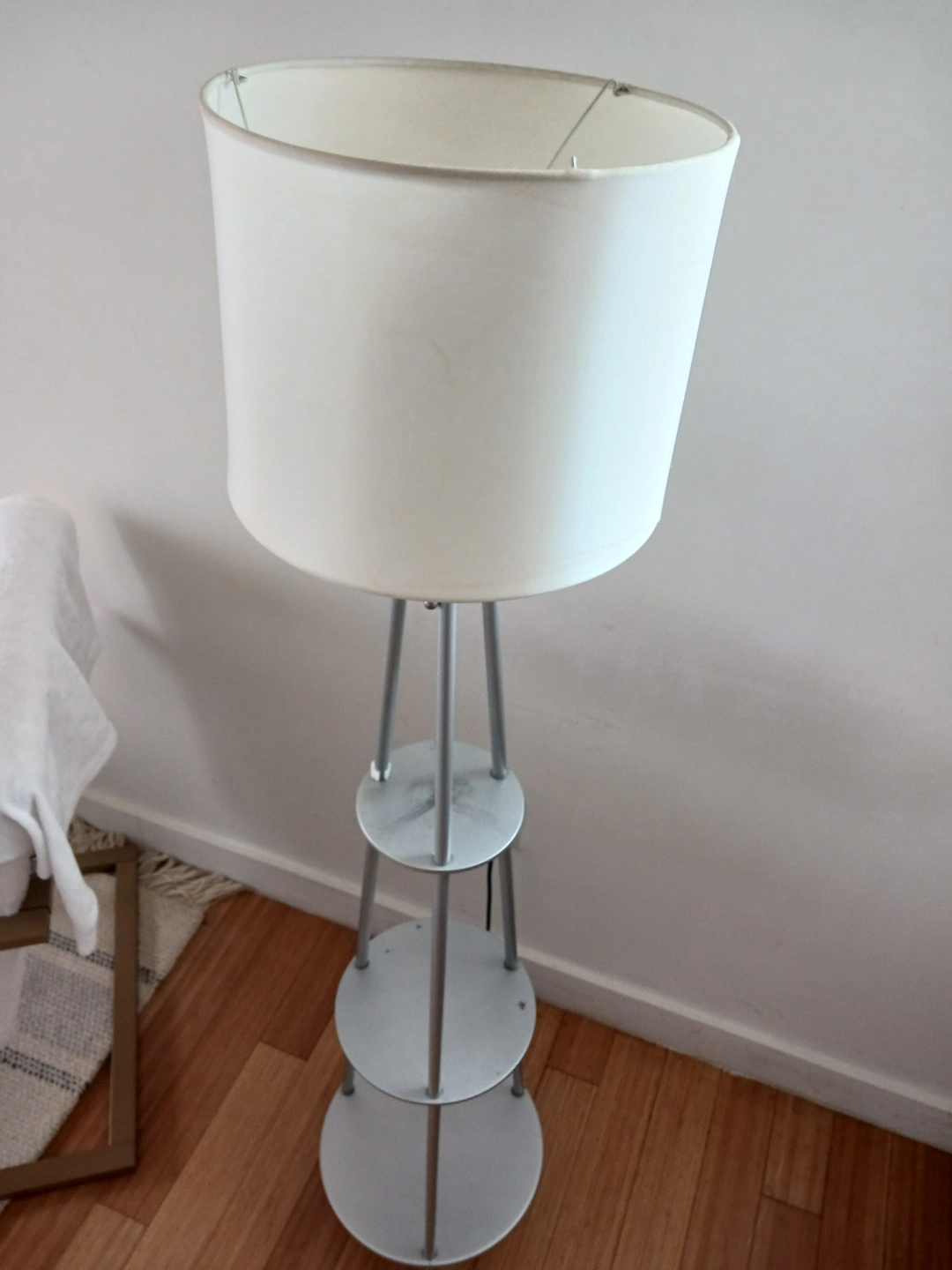 Silver metal floor lamp with 3 built-in shelves Modern, space-saving design Works perfectly – no damage Great for bedrooms, living rooms, or small spaces Meet-up: 269 East Burnside Avenue, Bronx, NY 10457 Pick up and delivery available | Serious buyers only First come, first served. Message if you're ready to pick it up today!