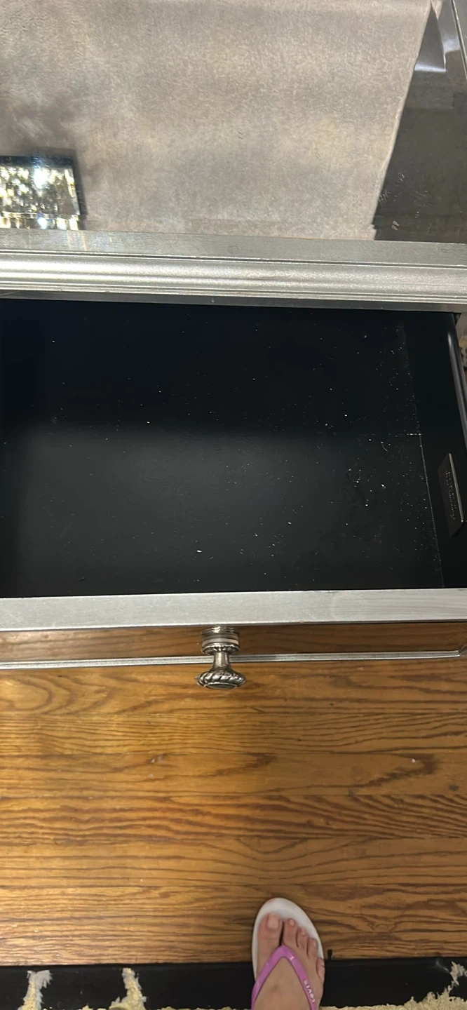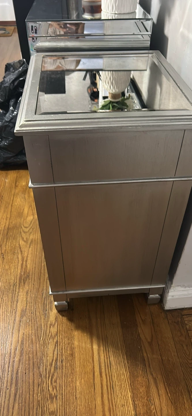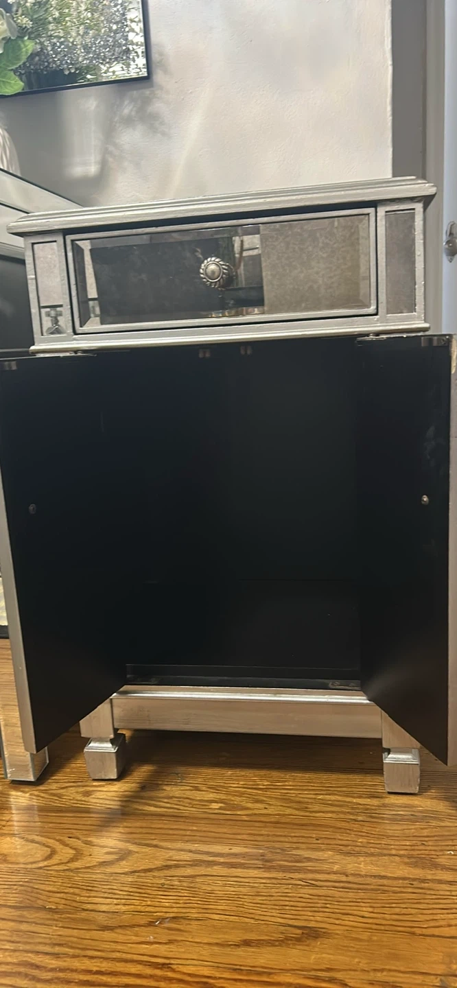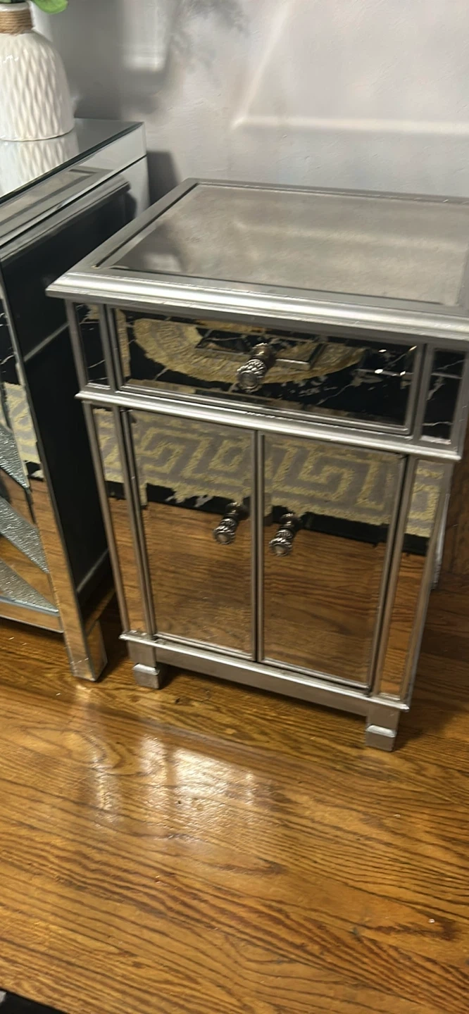 Selling a mirrored nightstand with a silver finish. It features a drawer on top and a cabinet with doors below, perfect for bedside storage. The mirrored surfaces add a touch of elegance to any room