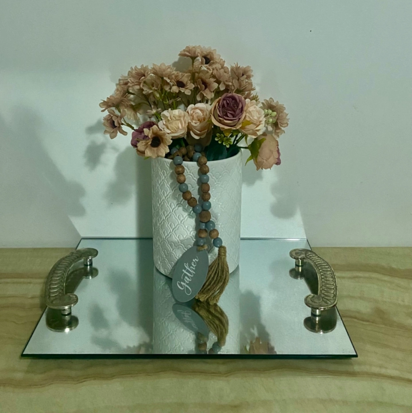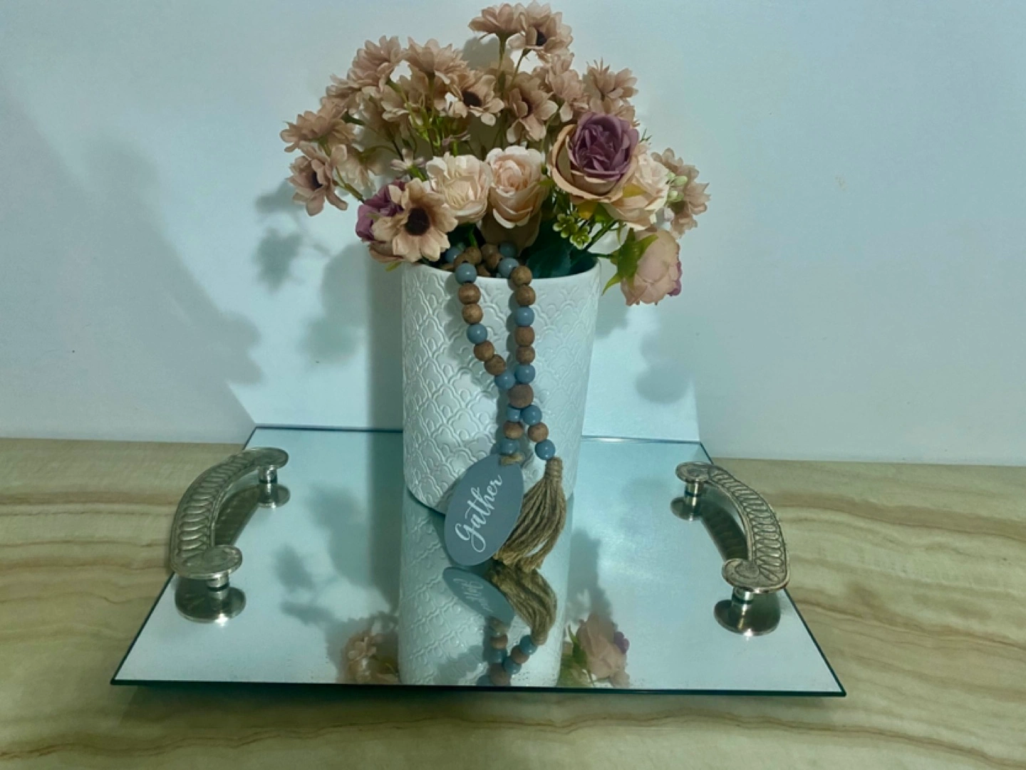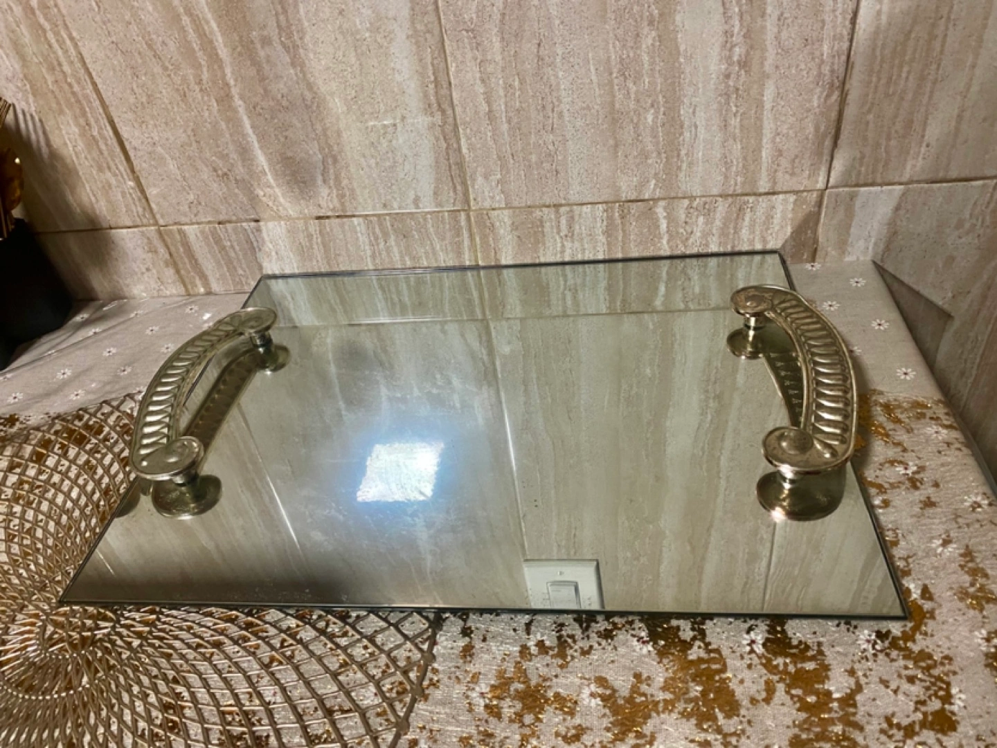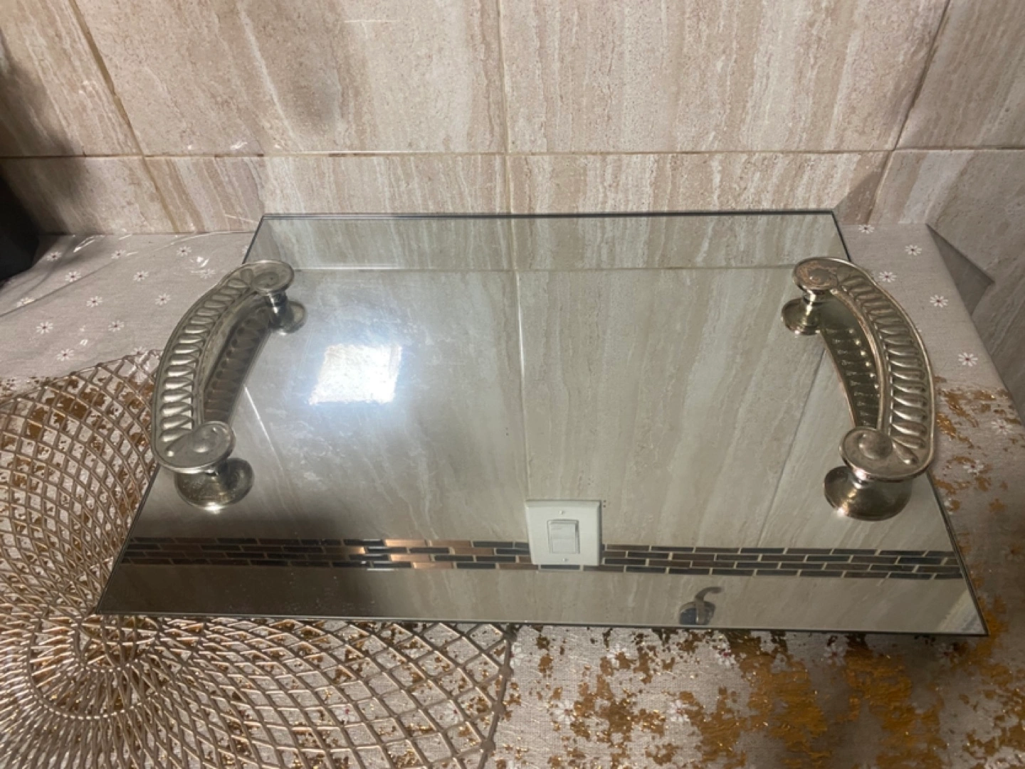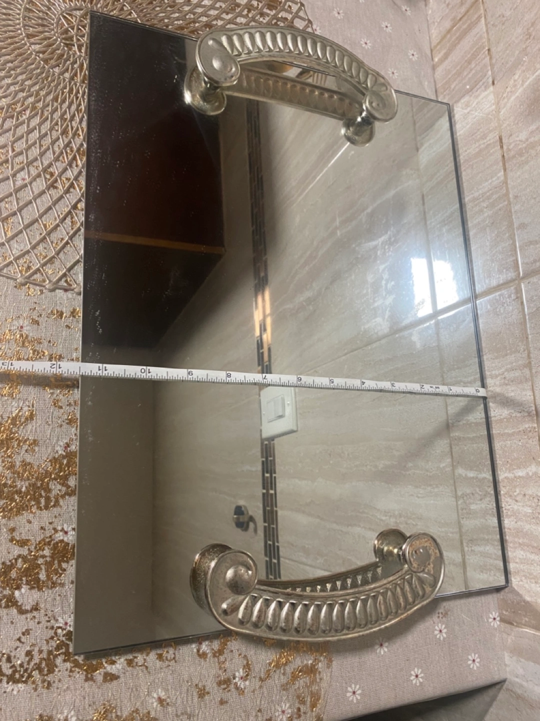 82Large mirrored tray with ornate silver handles. Measures approximately 15 inches long.pick up Ozone park,Queens 11416