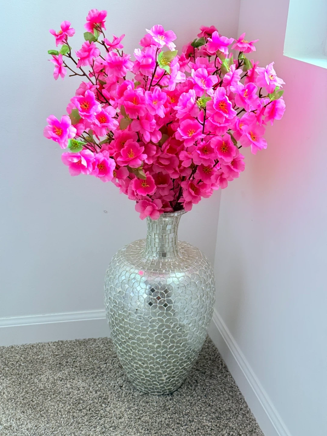 5A beautiful silver mosaic vase paired with vibrant pink cherry blossom branches! This eye-catching piece will add a touch of elegance and color to any room. Perfect for adding a pop of spring to your home decor